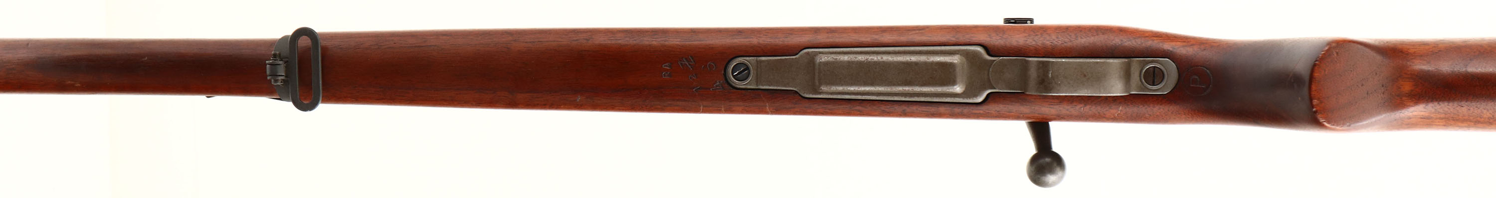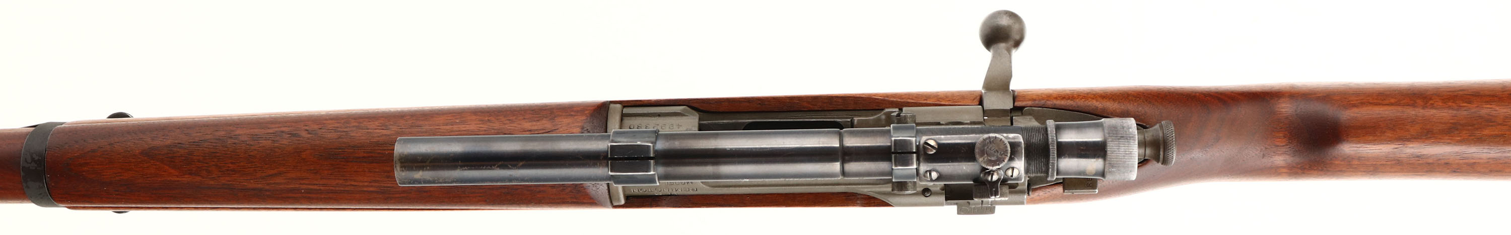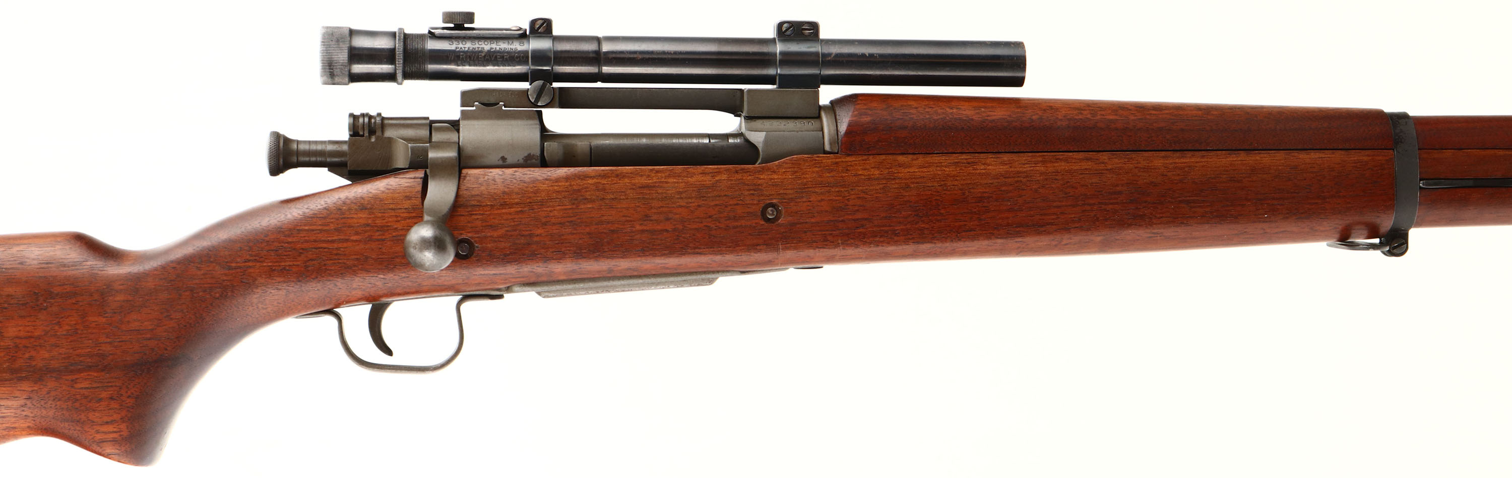 Remington. Model: 1903 A4 Sniper. Cal: 30-06. MFG: 1943. S/N: 4992380. Bolt action Rifle. 24'' round barrel. The replaced semi-pistol grip wooden stock is excellent with excellent finish & one light scrape on left side. There multiple replica cartouches stampings on the stock, left side is stamped with crossed cannons ''RA-P'', ''P'' in circle on bottom behind trigger guard. In front of magazine stamped ''RA'', ''1 2'', ''Z'' with line through & three dot in box & ''4 S''. Barrel & receiver retains 90% parkerized finish, with very light wear. Bolt is parkerized rather than blued. Top front of receiver is marked ''U.S.'', ''REMINGTON'', ''MODEL 03-A3'', S/N. Top of barrel out at muzzle is marked, ''R A'', Flaming bomb, ''12-43'', Bolt handle & cocking shroud are marked with ''R'', Cocking shroud is marked with ''33'' in circle. Bore is excellent. Mounted with a Weaver 330 M8 scope, with has ''U.S. PROPERTY'' Electro Penciled on left side. Scope mounts marked ''REDFIELD''. No front sight. Sling & stacking loops. Military style trapdoor, worn gun metal gray. Action is tight & appears to function correctly. Excellent overall condition. FFL or C&R Req. - Value: 2000 to 4000