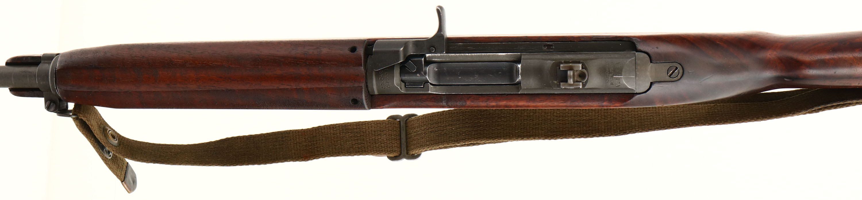 National Postal Meter, M1 Carbine, CAL: .30 Carbine, MFG: 1944, S/N: 4107214, Semi-Auto Rifle, 18'' Round Barrel. The refinished flat pistol grip wood stock is very good, displaying contusions, scrapes & dings, with areas darkened from oils. The stock displays cartouches, the right side is stamped ''NPM'', ''FJA'' in a box & ''Crossed Cannons''. The cartouche on the left side of the stock is very faint & not legible. Sling slot is marked, ''TRIMBLE''. The top of the wrist is stamped with ''Flaming Bomb''. The receiver rates 95% with light wear, & the barrel has toned to metal grey. The back of the receiver is marked in three lines, ''NATIONAL POSTAL METER, S/N''. The front top of receiver is marked, ''U.S.CARBINE'', ''CAL. 30M1''. The barrel band is marked, ''U'', front sling swivel marked, ''UN'' & top of the barrel end is marked, ''MARLIN''. Additional markings on the gun are as followed: Type II trigger housing marked ''N16'', Type II hammer marked ''IN'' & ''NPM'', Type III recoil plate marked ''LN'', Type I sear marked ''SW-N'', lug is marked ''N17'' on the bottom, Type III slide marked ''N10'' inside wide joint, Type I late swivel marked ''UN''. Bore is very good, bright & shiny with spots of roughness & thinned rifling. The barrel holds a blade front sight, with protective wings & is marked, ''N''. The rear sight is a two position aperture sight. Buttstock carries a checkered metal military style buttplate. Comes with correct period green cloth sling, & two 15 Rd. mags, one marked ''IA'', other is marked, ''SW''. This M1 Carbine is in its early configuration. There were only 125k produced with a Marlin barrel. FFL or C&R Req. - Value: 800 to 1600