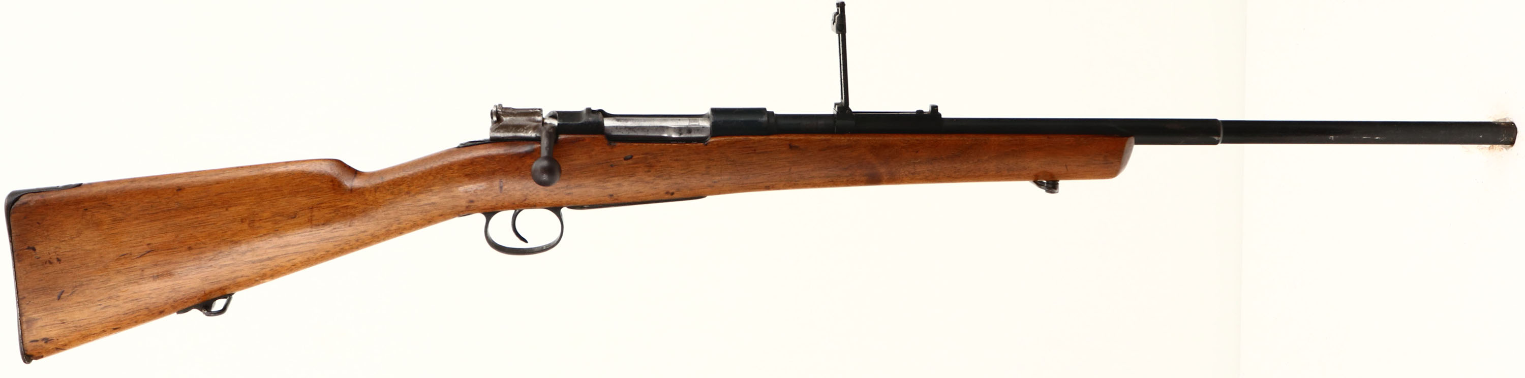 Spanish Mauser. Model 1893. Cal: 7x57mm. MFG: 1896-1943. S/N: 2666. Bolt action rifle. 22'' Barrel. The straight wrist wooden stock is good, stock has been cut down, holes drilled in stock on left side by magazine, small chip at toe, stock has scratches, dents, gouges & wear from use. The Metal has been Re-finished with a black paint, paint has worn away in spots to show original finish underneath. Left side of receiver is marked with S/N, ''MAUSER ESPANOL MODELO 1893'', Left side of barrel is marked with S/N, ''7MM''. Bore is good, roughness with thinned rifling. No Front sight, V-notch ladder rear sight marked 4 to 20. Metal buttplate with wear & brown patina. Bottom sling swivels. FFL Or C&R Req - Value: 100 to 200