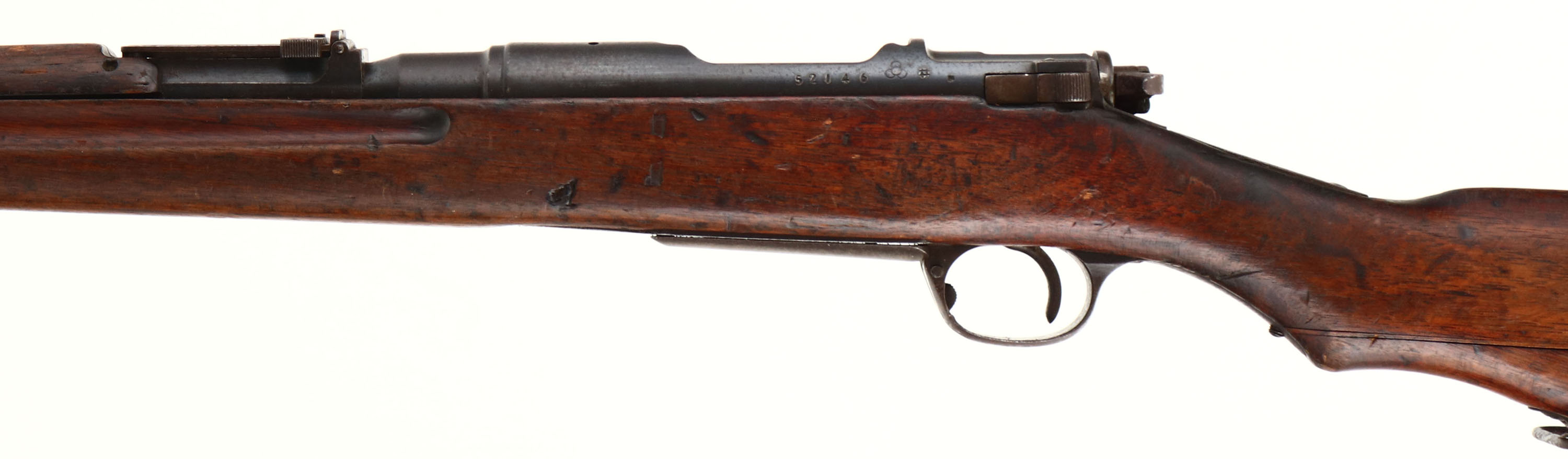 Tokyo Arsenal. Model: Type 30. Cal: 6.5 Jap. MFG: 1897-1906. S/N: 52146. Bolt Action Rifle. 30 1/4'' Barrel. The semi pistol grip wood stock is very good with Factory stock repair at joint of two piece stock on left side, crack down whole top if upper handguard, scratches, chips, dents, gouges & wear from use/age, cartouche on right side of stock ''96''. The metal finish rates 90% overall with light patina speckling. Left side of receiver is marked with S/N, arsenal stamp, top of receiver is marked with chrysanthemum that has stamp over top of it & ''Type 30'' In Japanese, S/N mismatched bolt. Bore is good, dark with roughness but has crisp rifling. Barleycorn front sight, V-notch Ladder rear sight marked 4 to 20. Metal buttplate with brown patina, & plate is slightly proud to the wood at toe. Bottom sling swivels, Cleaning rod. A nice and rare piece being the first ever Arisaka rifle this would make a nice piece to any Military collection. FFL Or C&R Req. - Value: 300 to 900