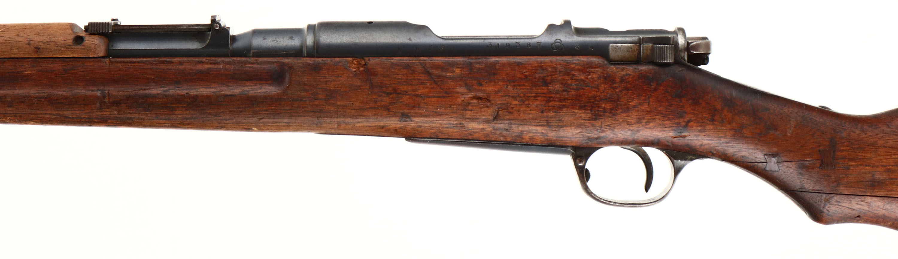 Tokyo Arsenal. Model: Type 30. Cal: 6.5 Jap. MFG: 1897-1906. S/N: 319387. Bolt Action Rifle. 30 1/4'' Barrel. The semi pistol grip wood stock is very good with Factory Crack repairs/reinforcement on both sides at wrist of stock, scratches, chips, dents, gouges & wear from use/age, cartouche on right side of stock that's Japanese lettering in box. The metal finish rates 95% overall. Left side of receiver is marked with S/N, arsenal stamp, top of receiver is marked with chrysanthemum that has stamp over top of it & ''Type 30'' In Japanese, S/N mismatched bolt. Bore is very good, light roughness & light darkening with sharp rifling. Front Barleycorn sight, V-notch Ladder rear sight marked 4 to 20. Metal buttplate with brown patina, missing lower screw & plate is proud to the wood at toe. Bottom sling swivels, missing cleaning rod. A nice and rare piece being the first ever Arisaka rifle this would make a nice piece to any military collection. FFL Or C&R Req. - Value: 300 to 900