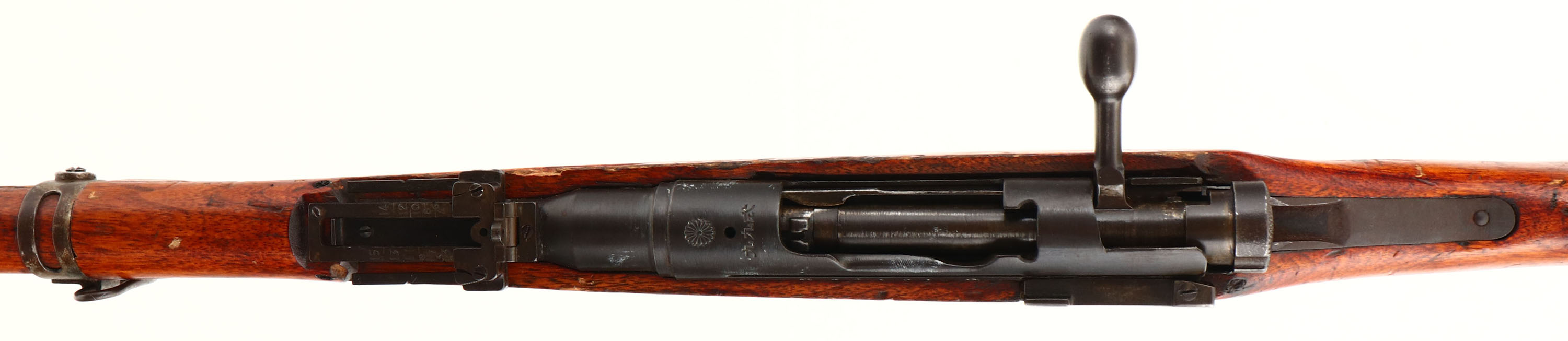 Kokura Arsenal. Model: Type 99. Cal: 7.7 Jap. MFG: 1939-1945. S/N: 22101. Bolt Action Rifle. 25'' Barrel. The semi pistol grip wood stock is very good with scratches, chips, dents, gouges & wear from use/age. The metal finish rates 90% overall with small spots worn to a gun metal gray, inside of magazine box, follower & spring all have surface rust. Left side of receiver is marked with S/N, arsenal stamp, top of receiver is marked with Intact chrysanthemum & ''Type 99'' In Japanese, S/N matched with bolt. Bore is very good, bright & shiny with thinning rifling. Barleycorn front sight with protective ears, Aperture Ladder rear sight marked 3 to 15, Has folding anti-aircraft sight wings & are marked 2 to 3. Metal buttplate with wear & brown patina. Side sling swivels & cleaning rod. This is a really nice example of a early type 99. FFL Or C&R Req. - Value: 250 to 500
