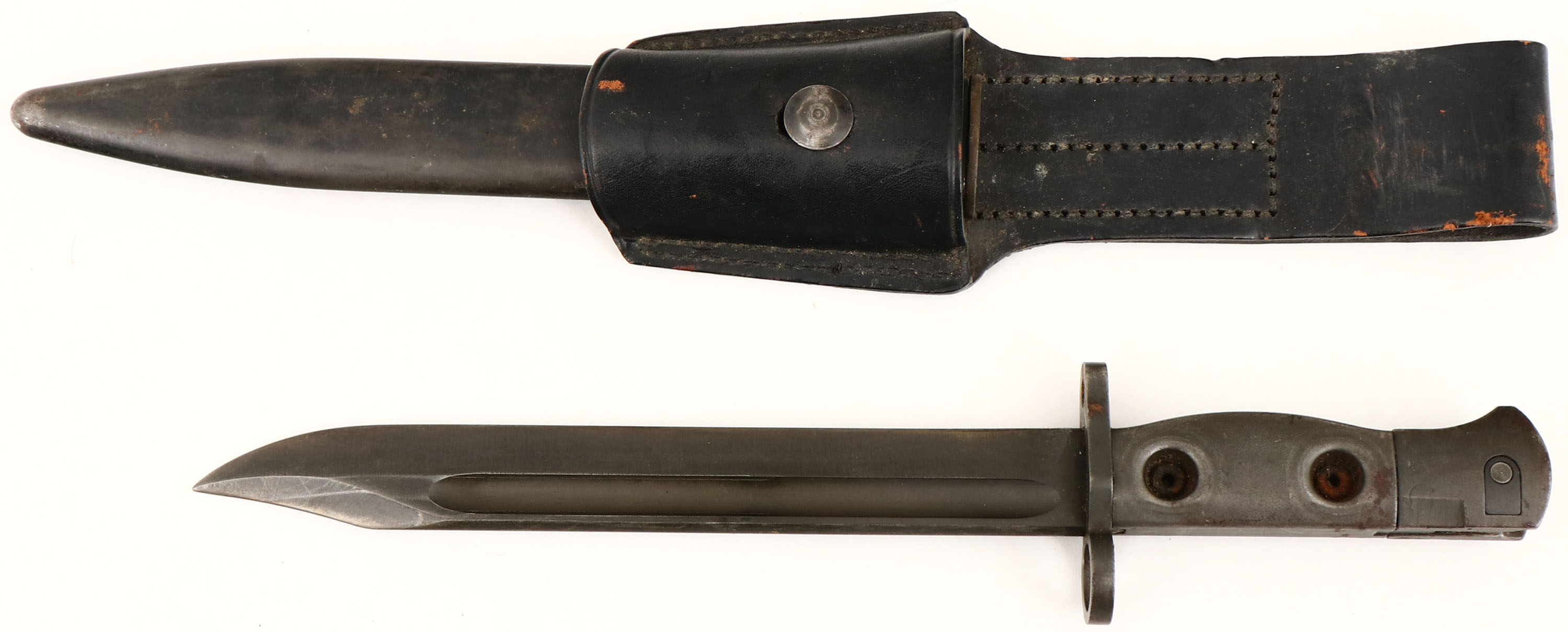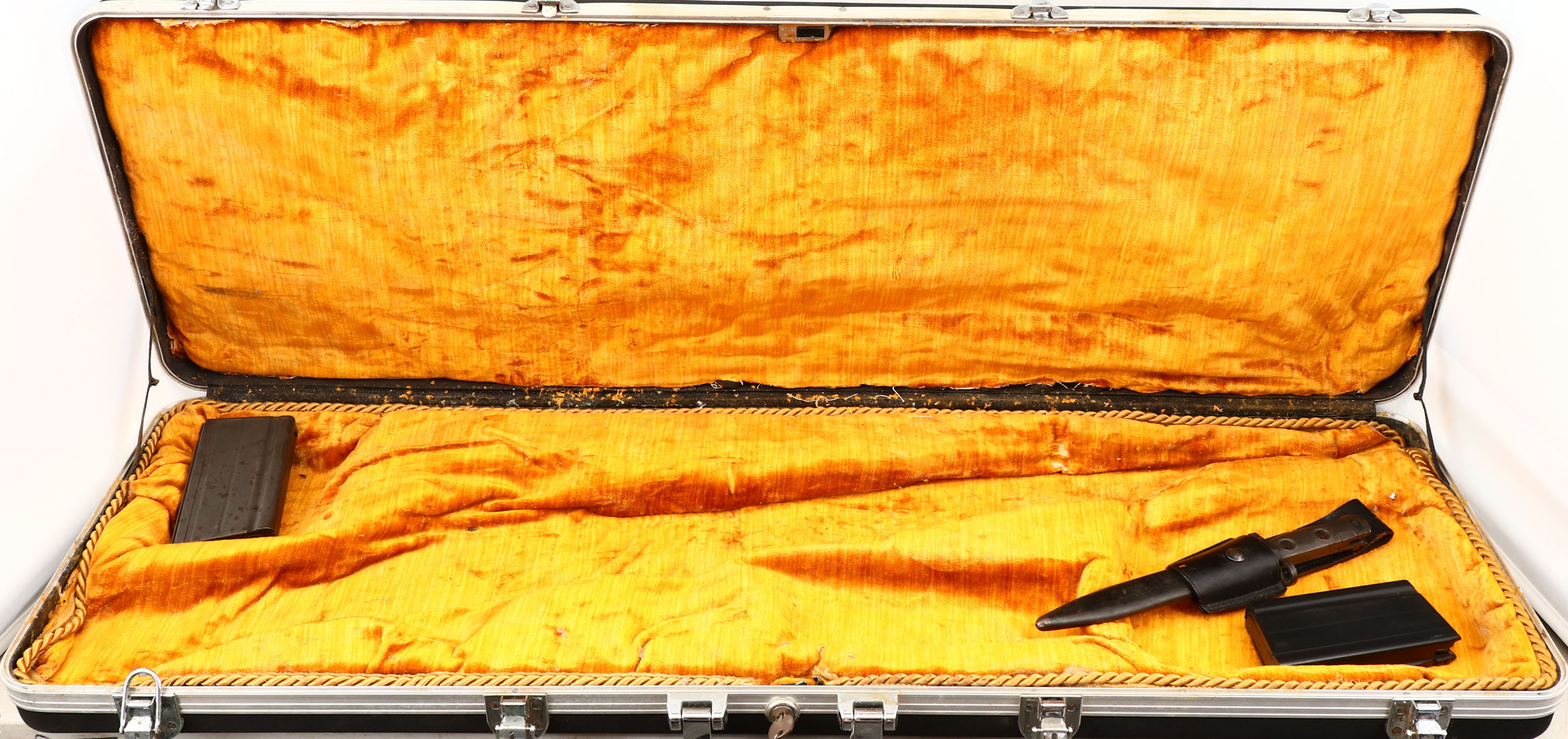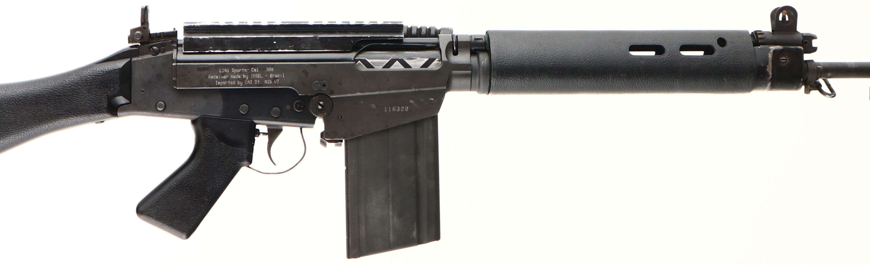 Imbel. Model: FAL L1A1. Cal: .308. MFG: Modern. S/N: 116320. Semi-Auto Rifle. 20'' Barrel. The synthetic stock is very good, with scratches & light wear. The metal finish rates 80% overal,l with spots of wear. Left side of receiver is marked ''UB60 A73882'', right side of receiver is marked ''L1A1 SPORTER CAL. 308'', ''RECEIVER MADE BY IMBEL - BRAZIL'', ''IMPORTED BY CAI ST. ALB VT'', Bore is excellent. Post front sight with protective wings, two position aperture rear sight. Plastic buttpad. Comes with three 20 Rd. mags, bipod, bayonet, with sheath & frog. Comes in a gold velvet lined hard case. FFL Req. - Value: 1200 to 2400