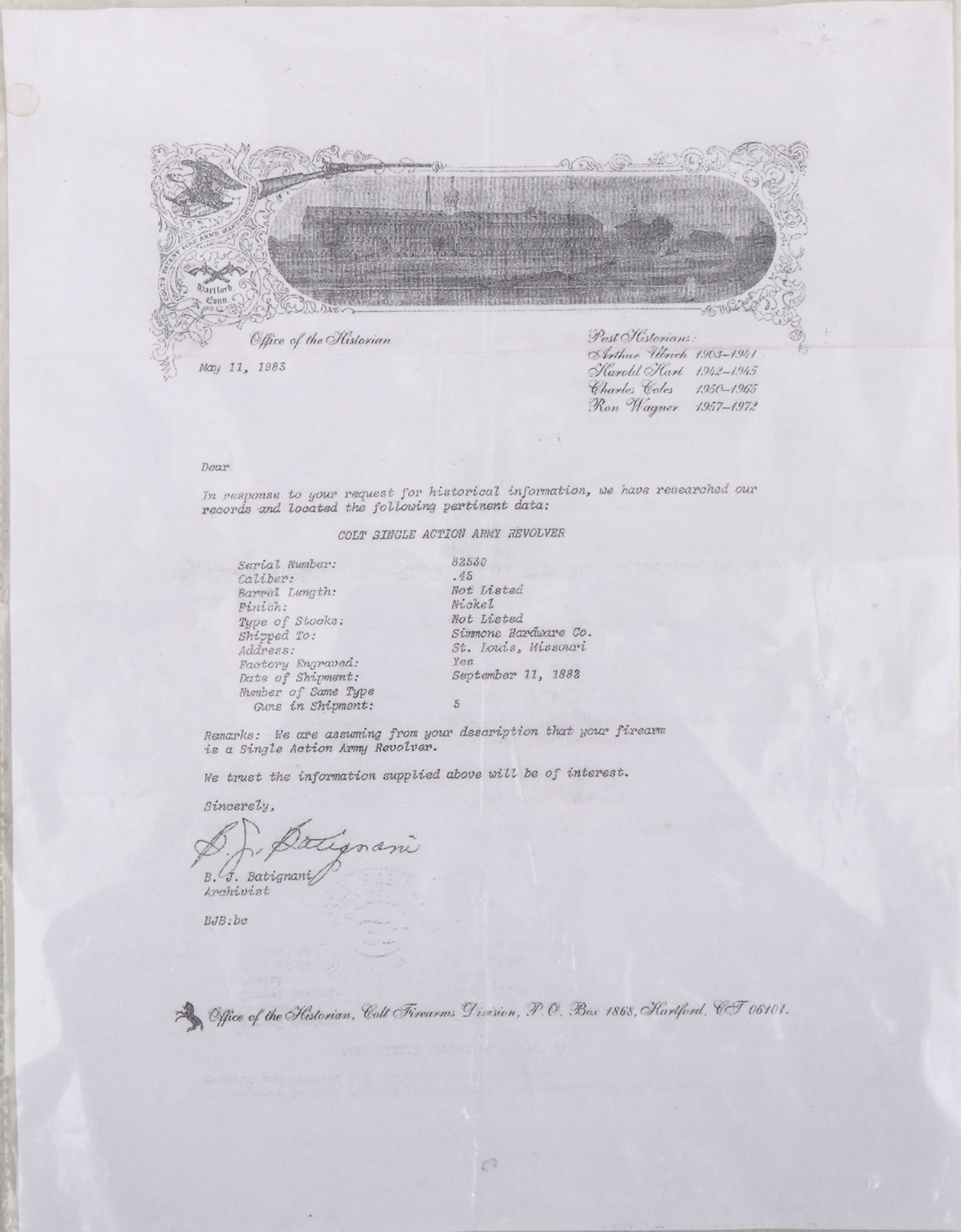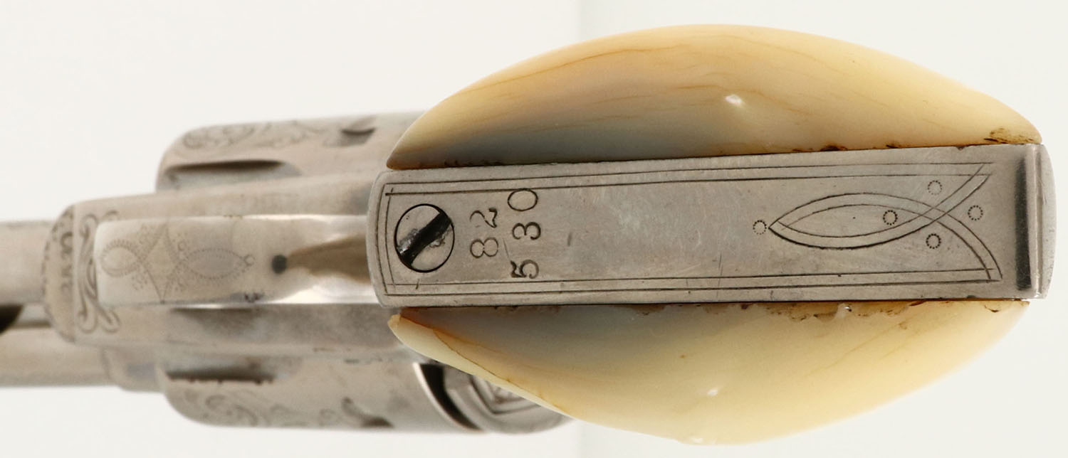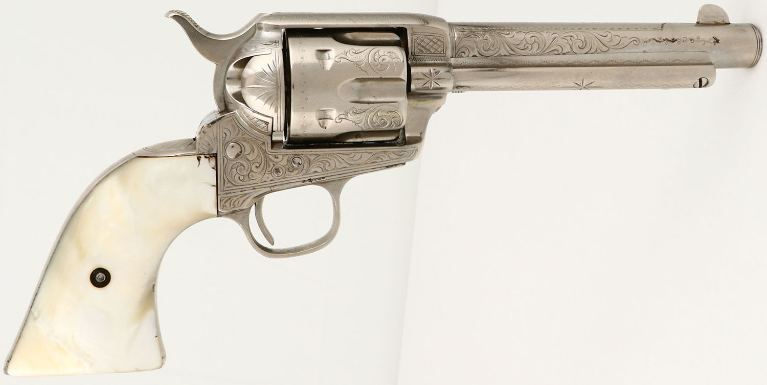 OUTSTANDING Colt, SAA, CAL: 45, MFG: 1882, SN: 82530, Single Action Revolver, 5 1/2'' barrel. This revolver is beautifully factory hand engraved. with scroll, vine & ornamental work on the frame, cylinder, barrel, barrel housing, trigger guard, backstrap & butt. The authentic Mother of Pearl grips are very good, with minor edge chips on the corners & a surface layer edge chip on the bottom of the right grip that has smoothed over time & is not distracting. The nickel finish rates 98% overall, with a couple of areas of light spotting & speckling. Bore is excellent & bright. The barrel holds a blade front sight & the frame has an integrated groove rear notch. This revolver comes with a copy of a Colt Factory letter, confirming the configuration & dates. This is a truly outstanding example of a factory nickeled & factory engraved Colt SAA.* Antique, No FFL Req. - Value: 12000 to 18000