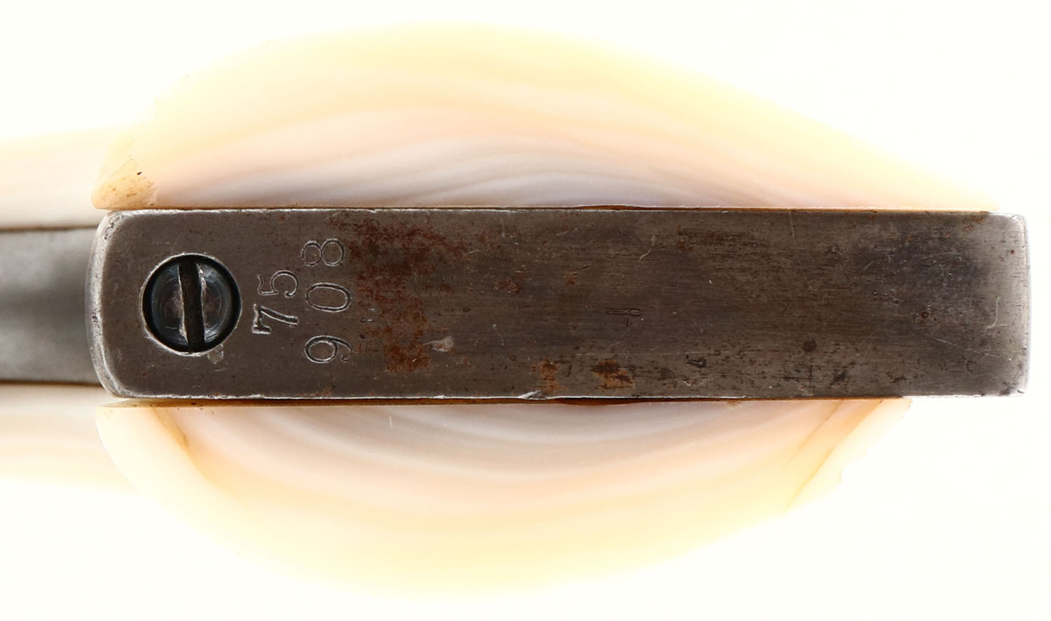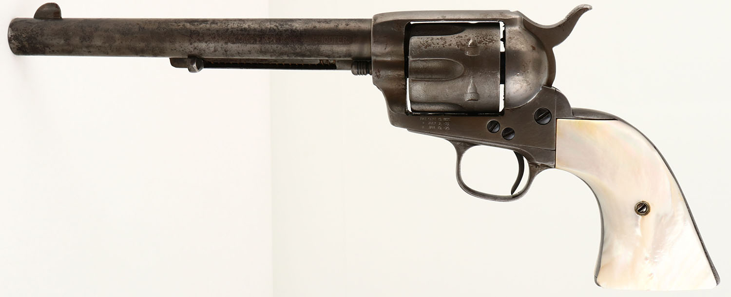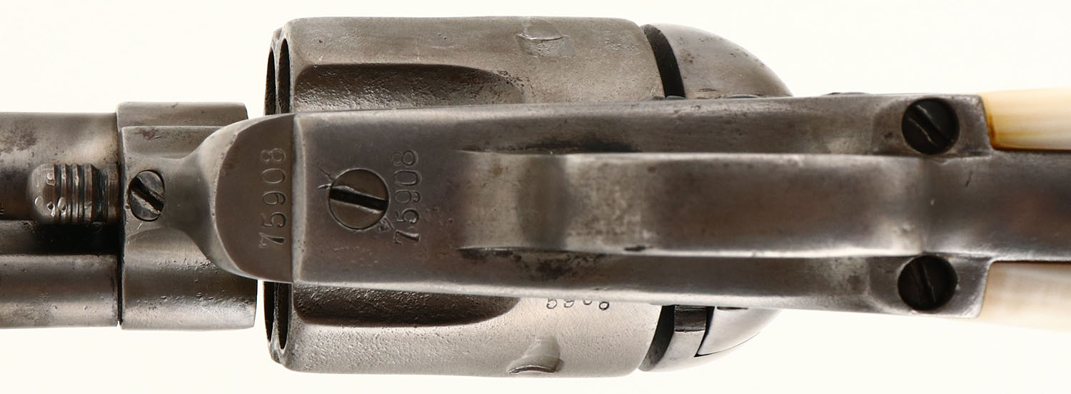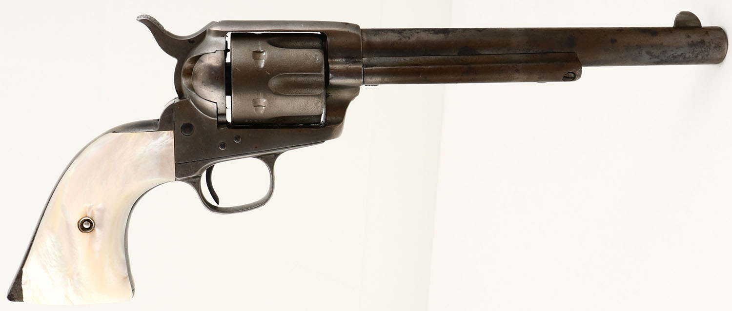 Colt, SAA, CAL: 44-40, MFG: 1882, SN: 75908, Single Action Revolver, 7 1/2'' barrel. The Mother of Pearl grips are very good, displaying looks of fire & color, but with a couple small nicks on the left grip & a larger corner chip on bottom rear of the right grip. The top of the barrel is marked in a single line address ''COLT'S PT.F.A.MFG Co HARTFORD CT. U.S.A'', the left side of the barrel has a rare etched panel that's barely legible, but says ''COLT FRONTIER SIX SHOOTER''. The left side of the frame is stamped with a three line patent dates ''PAT SEPT 19 1871, JULY 2,-72, JAN 19,-75''. The cylinder has a partial SN ''5908'' & the full SN is stamped on the frame, trigger guard & butt. The metal has fully worn to gun metal gray, with spotting & cleaned pitting. Bore is very good, with intermittent spotting near the muzzle, amongst proud rifling. The barrel holds a half-moon blade front sight. A nice pearl gripped early etched panel Colt SAA.* Antique, No FFL Req. - Value: 3000 to 6000