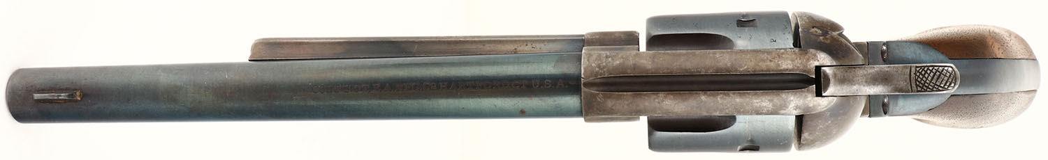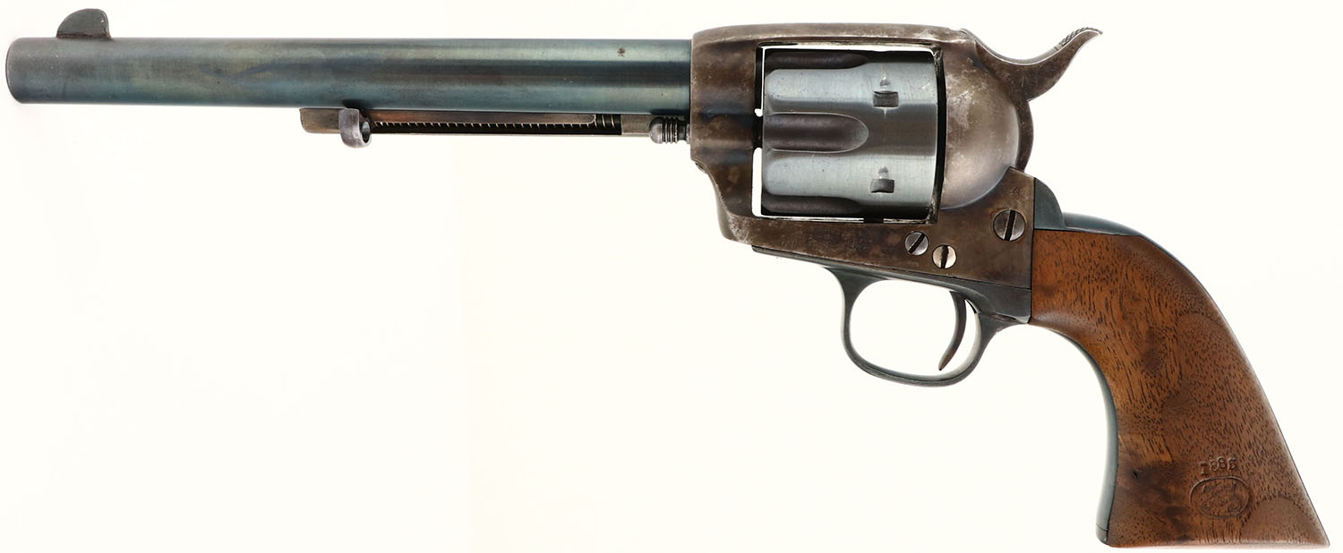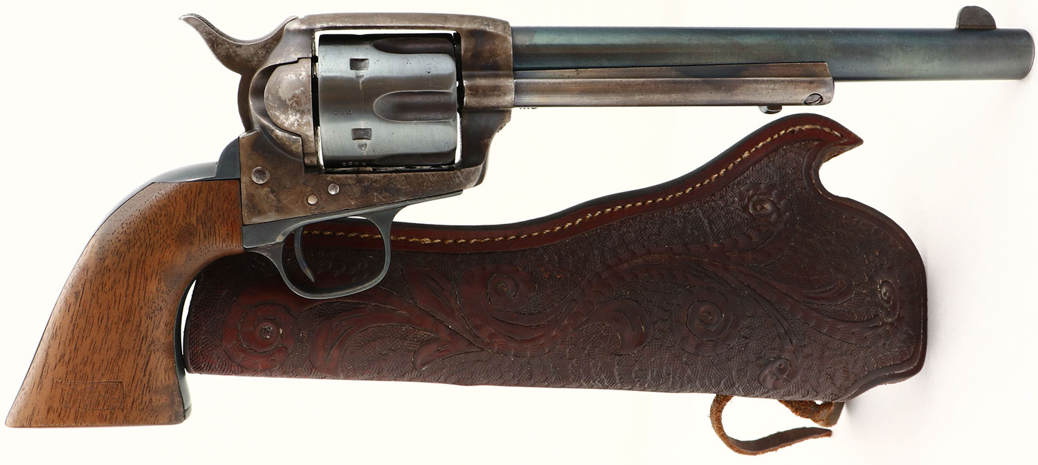 Colt, SAA, 1st Gen, CAL: 45 LC, MFG: 1885, SN: 116353, Single Action Revolver, 7 1/2'' barrel. This revolver has a partial professional restoration. The top of the barrel is marked, ''+COLT'S PT. F. A. MFG. Co. HARTFORD CT U.S.A+'', the left side of the frame is marked with a three line patent date, ''PAT SEPT 19, 1871 PAT JULY 2, 72, JAN 19 75'', followed by a ''U.S'' marking. The full SN is marked on the frame, trigger guard, butt & a partial SN is stamped on the cylinder. You can find ''DFC'' inspector marks on the barrel bottom, frame, cylinder & the bottom of the right grip. The wood grips are very nice replacements & carry reproduction stampings, grips are in excellent condition. The left side displays a ''1885'' cartouche, over slightly worn initials, inside a circle. The right grip has a ''DFC'' cartouche in a rectangle. The metal blue finish on the barrel, trigger guard & backstrap has been refinished with a more modern blue rating 95%, with some polishing lines & previous contusions or wear under the current blue. The cylinder shows polish lines & has a lighter silver blue. The case-hardened frame displays faint tones & shadowing of case-colors, with an aged patina. The ejection rod housing is case-colored rather than blued. Bore is excellent. The barrel holds a replaced front blade sight, which has been slightly reshaped & has file marks along the upper edge. Comes with a fantastic hand tooled Jack of Diamonds ''Slim Jim'' holster in excellent condition. This is a nice looking example of a restored SAA. Antique, FFL Req. - Value: 1500 to 3000
