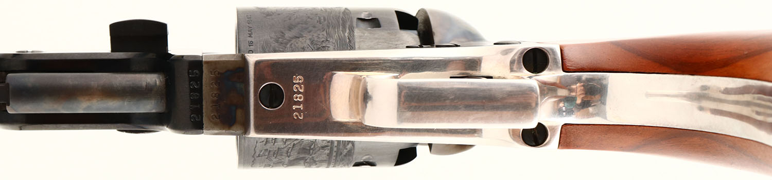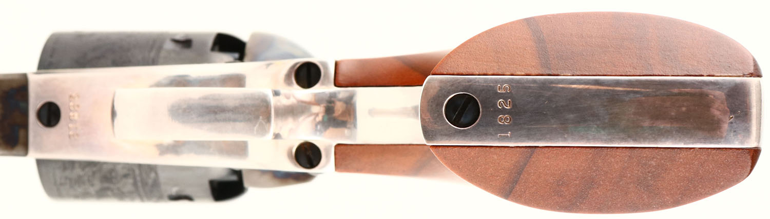BOXED, Colt, Model 1851 Navy, 2nd Gen. Colt Re-Issue, CAL: 36, MFG: 1976, SN: 21825, Single Action Percussion Revolver, 7 1/4'' barrel. The original wood grips are excellent, near mint. The metal blue finish on the barrel & cylinder rates 99%+. The frame & pack rod are case-hardened, retaining full case-color. The trigger guard & back strap are nickeled & excellent. Bore is mint. The barrel holds a single brass front bead. Comes nearly N.O.S. in original box, with paperwork. Black Powder, No FFL Req. - Value: 750 to 1200