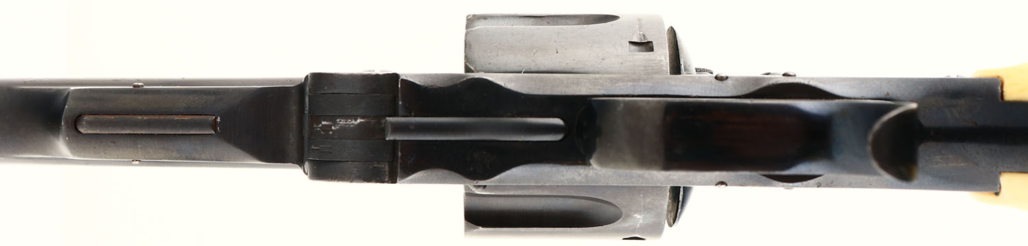 Smith & Wesson, 1874 3rd Model, Old model Russian, Cal. 44 Russian; MFG: 1874-78, SN: 4623, Single Action Revolver, 6 1/2'' barrel, air bore, good grips, 6.25'' barrel, Faux Ivory grips are excellent, with very nice coloring to match aged ivory. The metal finsh is an older aged professional reblue, retained at 95% & showing some scratches & pitting under the current blue. Bore is excellent, with some haze & speckling at the muzzle amongst strong rifling. The buttstrap stamped with 1874 above SN. The characteristics of the 3rd model are the trigger spur, large screw on top strap & a front sight forged into the barrel. Though refinished, this 3rd model Russian revolver is quite collectible & presents well. Antique, No FFL Req. - Value: 1000 to 2000