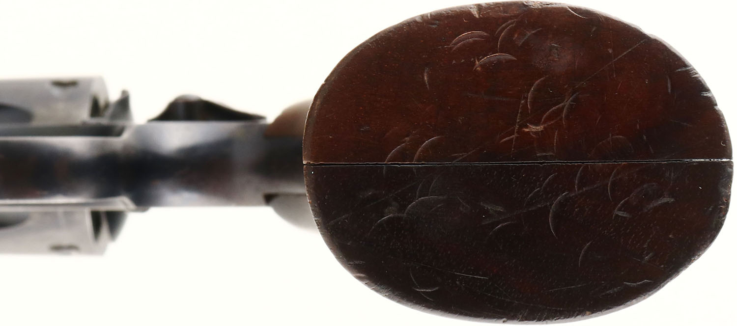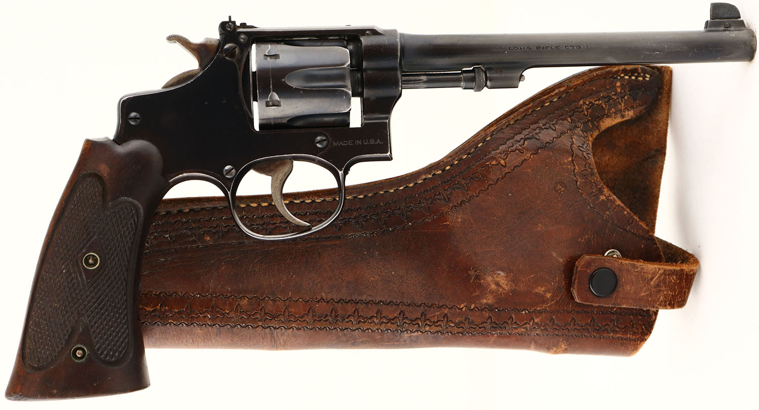 Smith & Wesson, Model 22/32 Hand Ejector, .22 LR Cal., Double Action Revolver, Mfg. 1911-41, SN: 472023, 6'' barrel, Original wood checkered grips are very good, with minor edge nicks & several small contusions on the bottom where it was used as a light hammer. The original high polish metal blue finish is 85%, with minor wear marks & spoeckling. The case-colors on the hammer & trigger are muted. Bore is very good. Comes with unmarked early leather holster. FFL & C&R Req - Value: 400 to 800