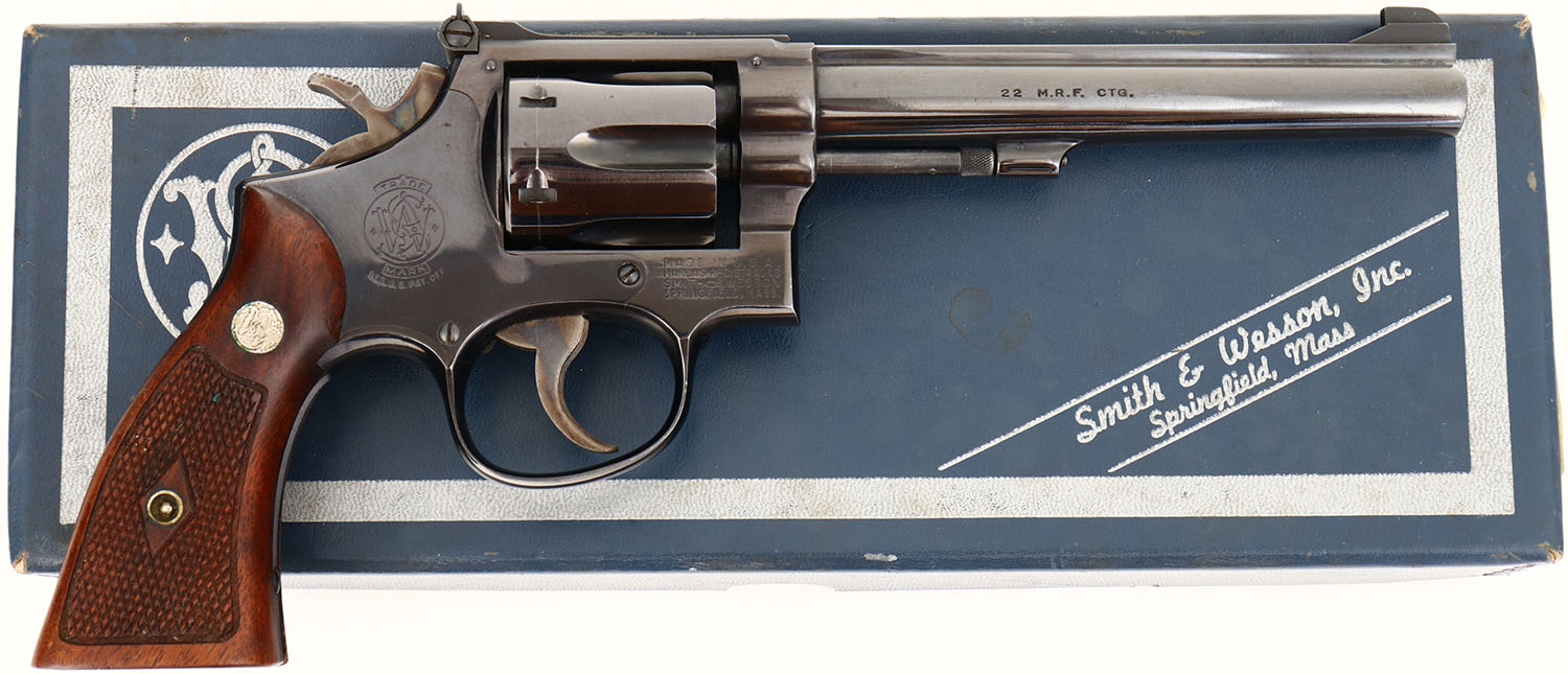 BOXED, Smith & Wesson, Model 48 (1st Variations), CAL: .22 MRF (WMR), Double Action Revolver, MFG: 1959, SN: K404825, 6'' barrel, The original checkered grips are excellent. The original high gloss metal finish is 98%. Case-hardened hammer & trigger, strong colors. Adjustable rear & ramp front sights. Bore is excellent. Comes in original SN matching box, with original paperwoork & wax paper. FFL or C&R Req. - Value: 600 to 1200