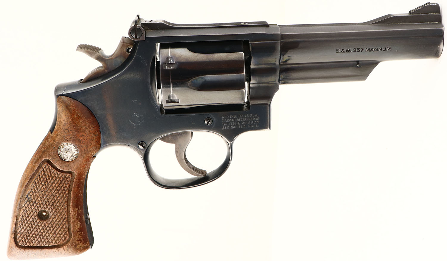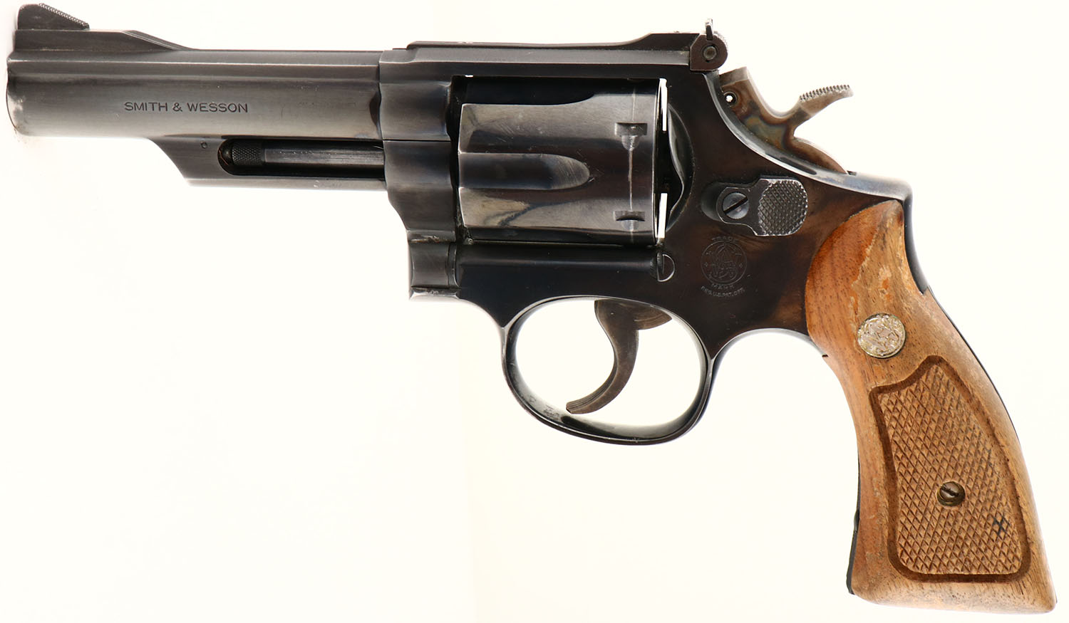 Smith & Wesson, Model 19-5, CAL: 357 MAG, MFG: 1985, SN: 145K838, Double Action Revolver, 2 1/2'' barrel. The factory brass medallions & checkered wood grips are very good, but with finish wear from use & handling. The original blue finish is 92%, with most loss due to muzzle wear. Case-colored hammer & trigger. Bore is excellent. Adjustable square notch rear sight & ramp blade front sight. Overall, a very nice condition. FFL Req. - Value: 400 to 800