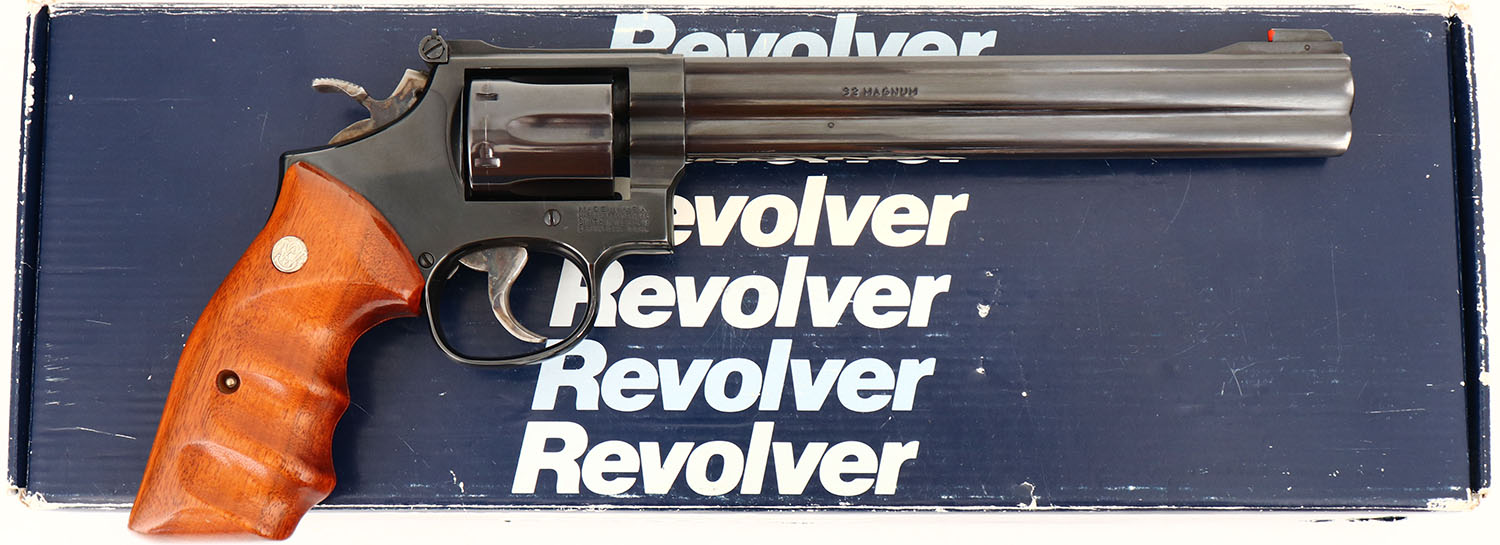 BOXED, S&W, Model 16-4, N-Frame, .32 Magnum, Double Action Revolver, Mfg. 1989-92, SN: BFE5934, 6'' barrel, The original wood grips are excellent, The original blue finish is 99% with a light drag line on cylinder, The case-hardened hammer & trigger have their full vivid case-colors. Mechanically mint/excellent. Bore is mint, Excellent original blue & white matching box, has paperwork & original wrapping paper. Very collectible blued finish Model 16-4. FFL Req. - Value: 1000 to 3000
