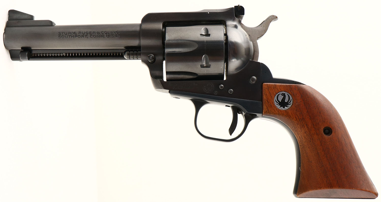 BOXED Ruger New Model Blackhawk, CAL: 357 MAG, MFG: 1971, SN: 30-53569, Single Action Revolver, 4 1/2'' barrel. The original Ruger wood grips are near mint, The polished blue finish rates 99% overall. Bore is excellent. Factory sights. Comes with original box with paperwork & wax paper. FFL or C&R Req. - Value: 500 to 1000