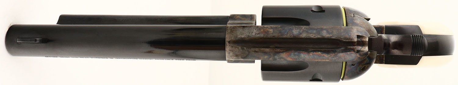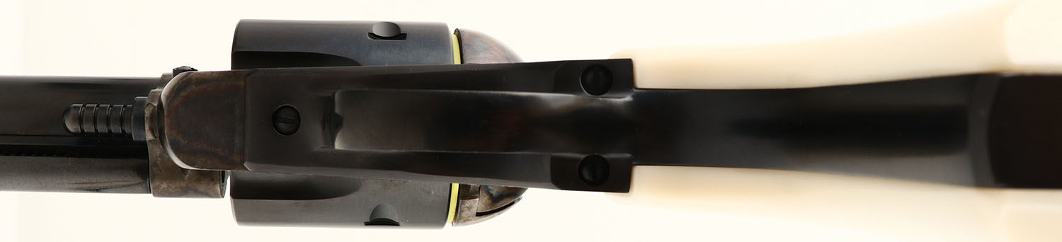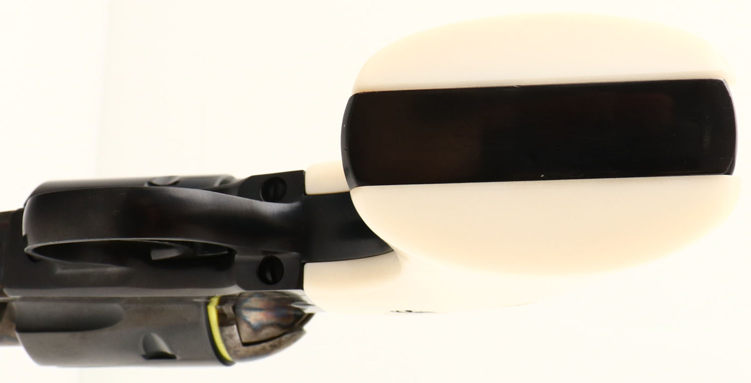 CASED Ruger Model ''Vaquero'', CAL: 45, MFG: 2003, SN: 58-18728, Single Action Revolver, 5 1/2'' barrel. The faux ivory grips with medallion Ruger logo are mint. The polished blue finish rates 100% overall, with vivid case colors on receiver. Bore is excellent, near mint. Factory sights. Comes with original box with paperwork, lock & spent shell fired at factory, NIB. FFL Req. - Value: 500 to 1000