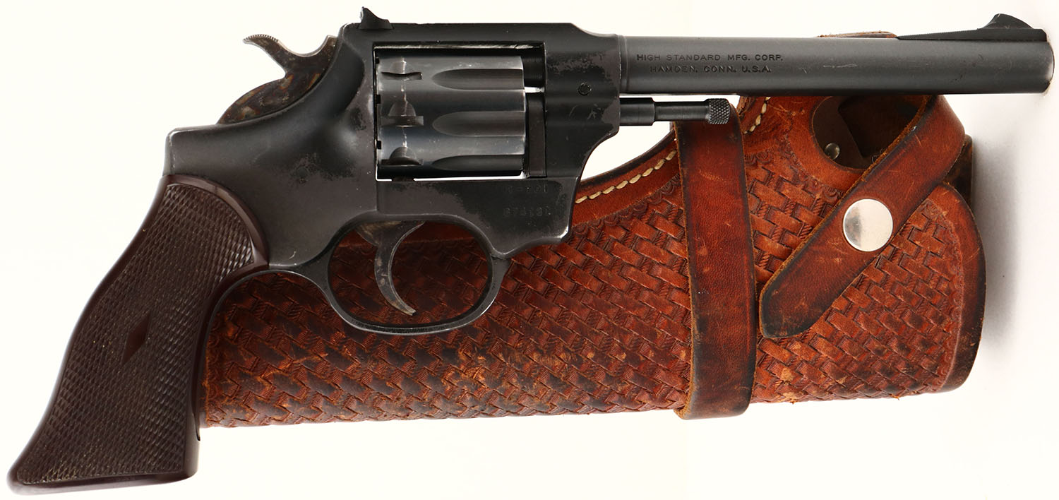Hi Standard Model Sentinel R-101, marked .22 CAL, MFG: 1940, SN: 674131, Double Action Revolver, 6'' barrel. The checkered, brown plastic grips are excellent. The metal blue finish rates 95% on barrel, while the frame has 70% coverage, with areas of wear causing dullness . Bore is excellent. Factory sights. Action & cylinder timing function correctly. Comes with a fantastic tooled George Lawrence leather holster marked 25B, 5 1/2. FFL or C&R Req. - Value: 200 to 400