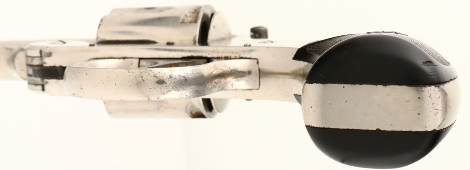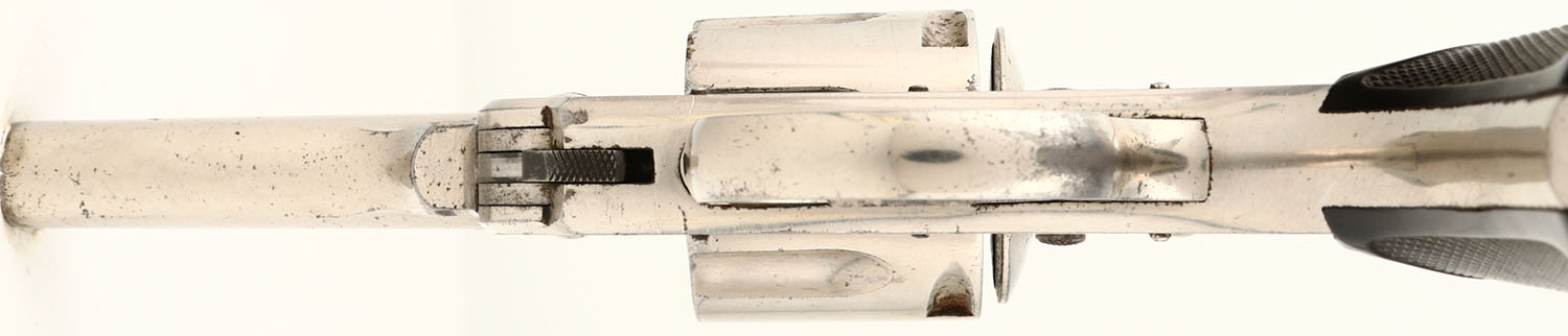 H&R, Top Break Auto Ejecting Model, CAL: 32, MFG: 1890-1898, SN: 5523, Double Action Revolver, 3 1/4'' barrel, 6 shot. The top of the rib is marked ''HARRINGTON & RICHARDSON ARMS COMPANY WORCHESTER, MASS, USA PAT'L OCT 4' 87''. The hard rubber checkered grips, with target logo are very good, displaying light smoothing wear from honest use. The metal nickel finish is 90%, with flaking dark spots. Bore is very good, with some roughness. Factory sights. Action & cylinder timing function properly. Antique, No FFL Req. - Value: 200 to 400