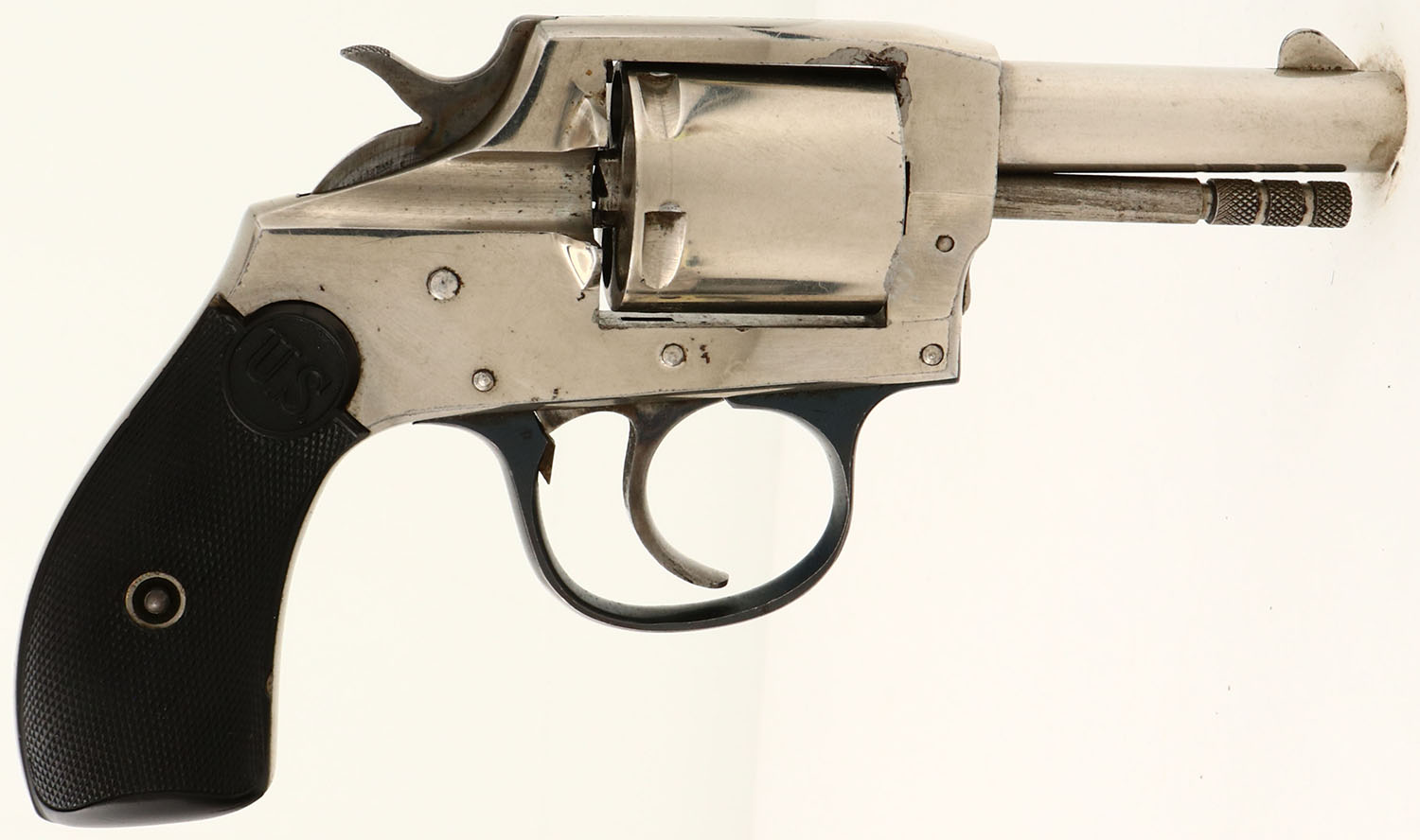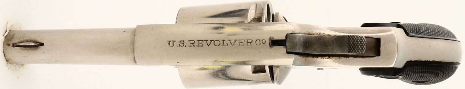 U.S. Revolver Co. Model: Solid Frame. CAL: .32 RF. MFG: 1910. S/N: 14249. Double-Single action. 2 1/2'' round barrel. The hard rubber grips are very good, with light wear. The metal nickeled finish rates 95%, with very little wear. Top of frame is marked, ''U.S. REVOLVER CO'', grips are marked, ''U.S.''. Bore is very good. Front blade sight. Trigger & hammer appear to function properly, but does not advance cylinder. Will need repair or adjustment. Sold AS-IS without return. FFL or C&R Req. - Value: 100 to 300
