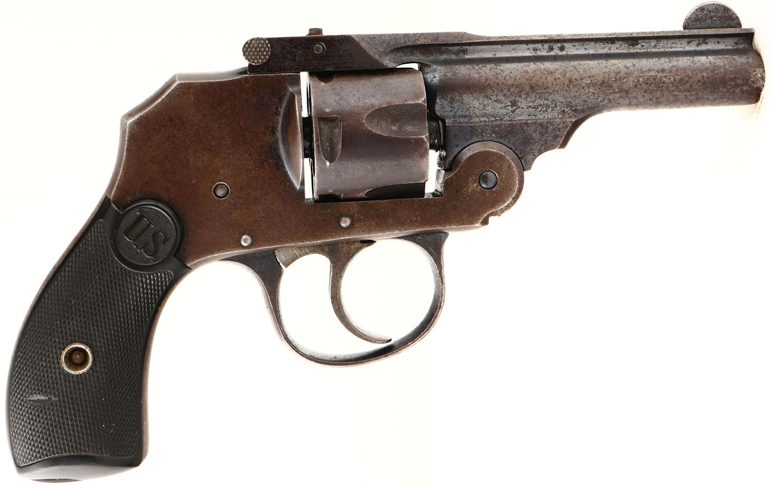 U.S. Revolver Co., Top Break Auto Ejecting Model, CAL: 32, MFG: 1920's, SN: 82636, Double Action Revolver, 3'' barrel, 5 shot. The top of the rib is marked ''U.S. Revolver Co. Made In USA''. The U.S. marked hard rubber checkered grips are very good. The metal blue finish has tones to a brown patina, with remains of original blue in protected areas. Bore is very good, with some roughness. Factory sights. Hammerless for ease of personal carry. Action & cylinder timing function properly. FFL or C&R Req. - Value: 50 to 200