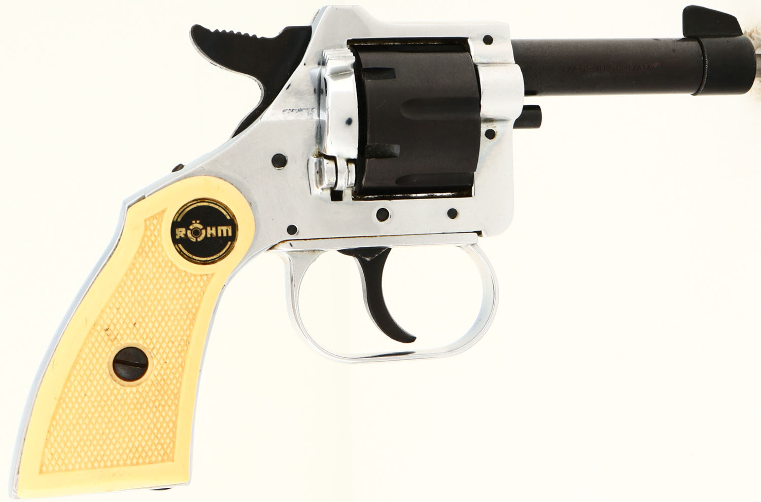 Rohm, Model RG-10, .22 Short Cal, MFG 1960's, SN: 462992, Double Auction Revolver Pistol, 2 1/2'' barrel, The checkered plastic grips are very good. The polished nickel frame finish is excellent, with barrel & cylinder showing 90% blue. Bore is excellent. FFL or C&R Req. - Value: 50 to 100