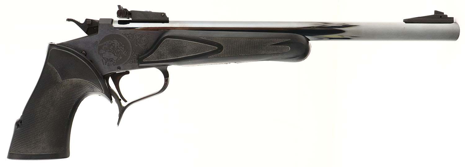 Thompson Center Arms, Model: Super 14 Contender, 2 barrel set .223 REM 14'' & 45 Colt 10'', Single shot, single action break barrel. Mfg. 1983. SN: 229486, 14 & 10'' barrels. The original checkered Pachmayr rubber grips are excellent, with some light wear. The original metal finish is 97% overall. Features an etched cougar perched on ledge on both sides of receiver. Has original sights. Bores are excellent. Easily interchangable barrels. Great target pistol. FFL Req. - Value: 600 to 1200