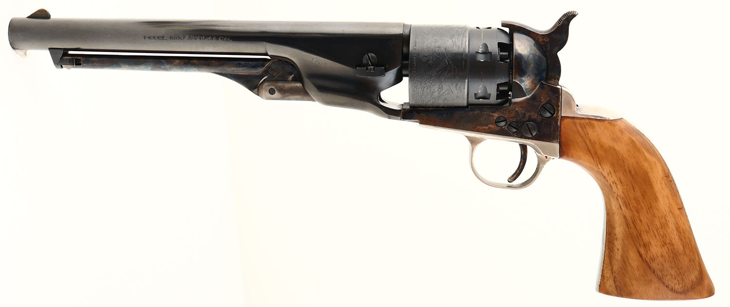 Lyman, Model 1860 Army, CAL: 44, MFG: Modern, SN: 22517, Black Powder Percussion Revolver, 7 3/4'' barrel. The wood grips are excellent. The engraved cylinder & barrel retain 98% original blue finish. The trigger, hammer, loading lever & frame all have vivid case-colors. The trigger guard & back strap retain 98% of nickel finish. Bore is excellent. The barrel carries a brass bladed front sight. Comes in a walnut wood box with a red lining, has tool, caps & old lead balls. A high condition, modern black powder revolver. Black Powder, No FFL Req - Value: 250 to 500