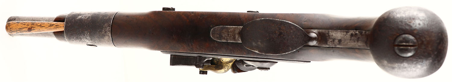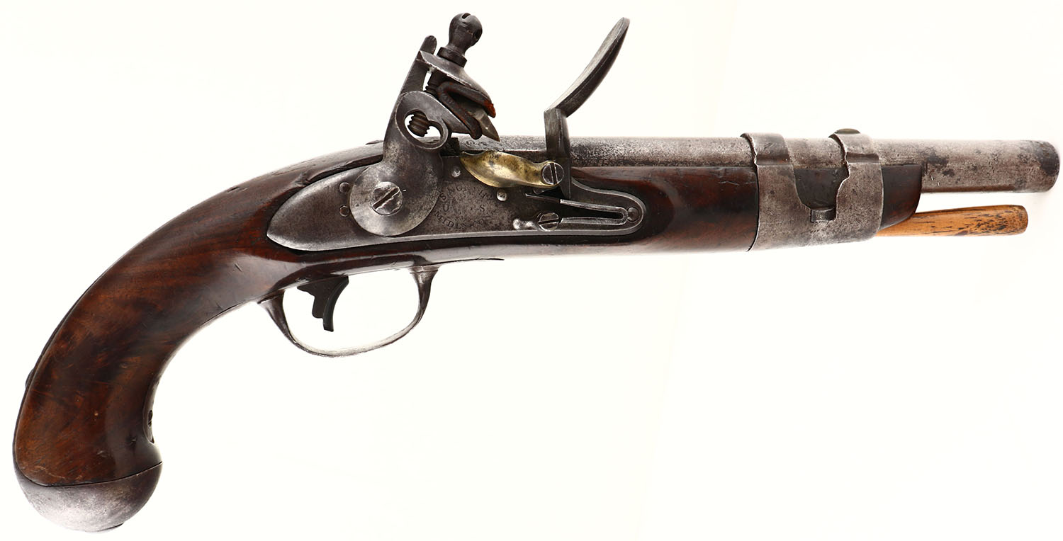 Simeon North U. S. Midln Con Flintlock pistol. 54 cal., MFG: 1813-1818, SN: NONE Single Action, U.S. marked & with Eagle stamp. Built between 1813-18, 8 1/2'' Heavy barrel, with a 9/16'' muzzle. The wood is very good, with lovely grain & a feathered pattern. The stock has a large crack repair at the top of receiver & spliced inlay repair at the left side of the buttend. The metal has worn gun metal gray, with a thin brown patina & rust pitting in areas. Brass component has a smooth aged patina. Locks are functional, with strong spring tension. Bore is fair, with roughness. Has a 8 3/4'' ramrod. In 1813, Simeon North of Middletown Connecticut was awarded a contract with the United States Government to make 20,000 pistols over five years. This was the first government contract ever signed for weapons with interchangeable parts. Overall, a very good condition & wonderful example of a rare antique US marked military flintlock pistol. No FFL Req. - Value: 1000 to 3000