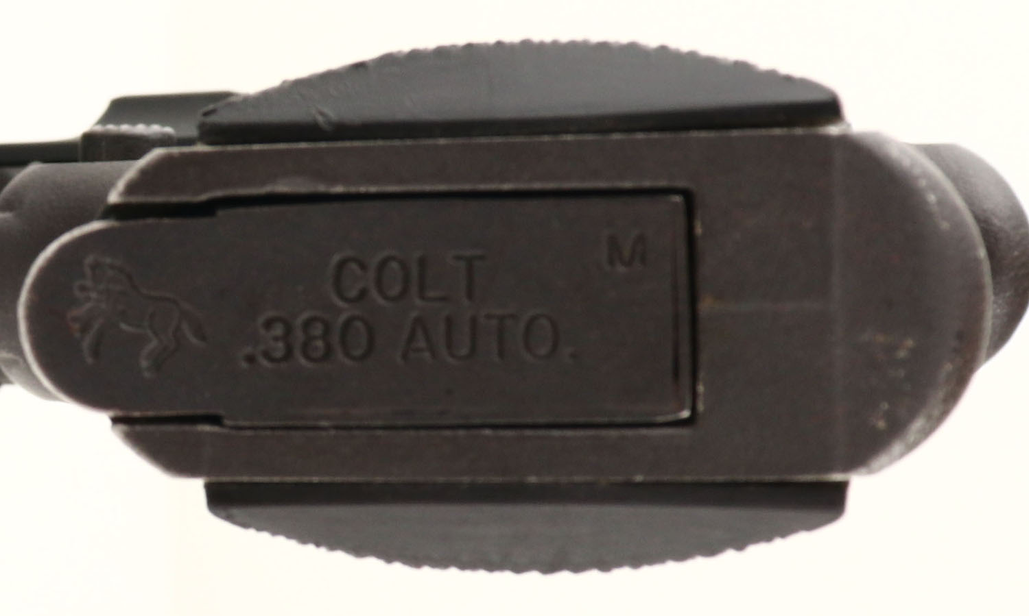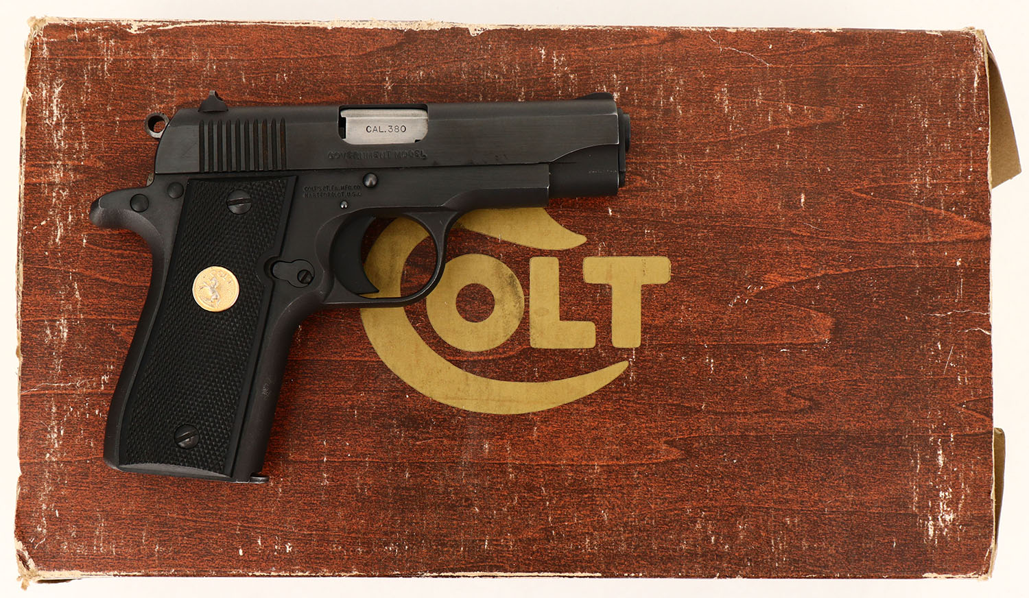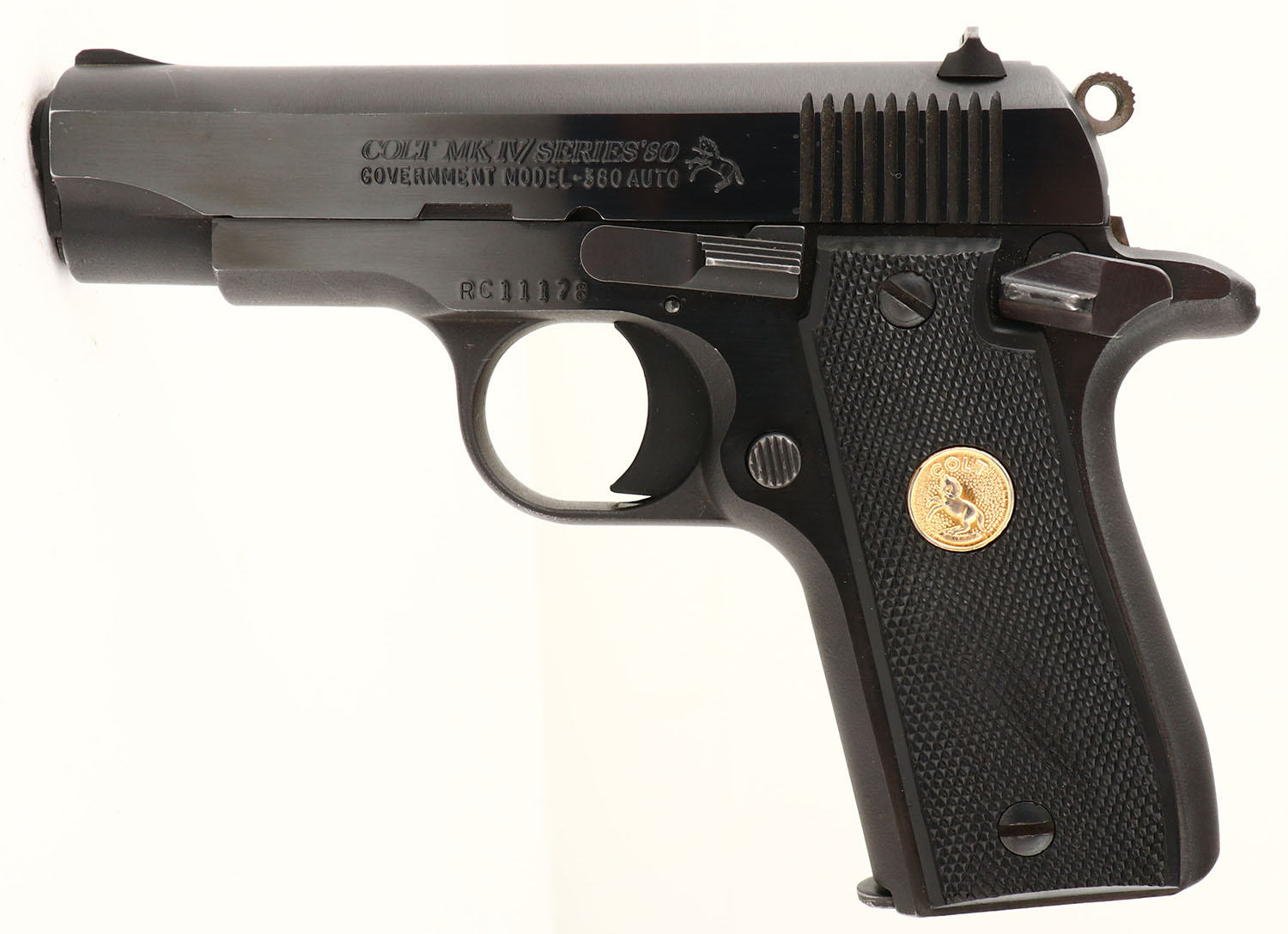Colt, Government Model MK IV Series' 80, .380 Auto Cal., Semi-Auto Pistol, MFG: 1980's, SN: RC11178, 3 1/4'' barrel, The original checkered plastic grips with medallions are excellent. Factory blue finish is 95%, with a few very minor storage marks, Bore is excellent. Comes in an oversized Colt wood grain printed box, which is missing an end flap, & is not original to pistol. This is a great looking & sweet shooting pistol. FFL Req. - Value: 800 to 1200