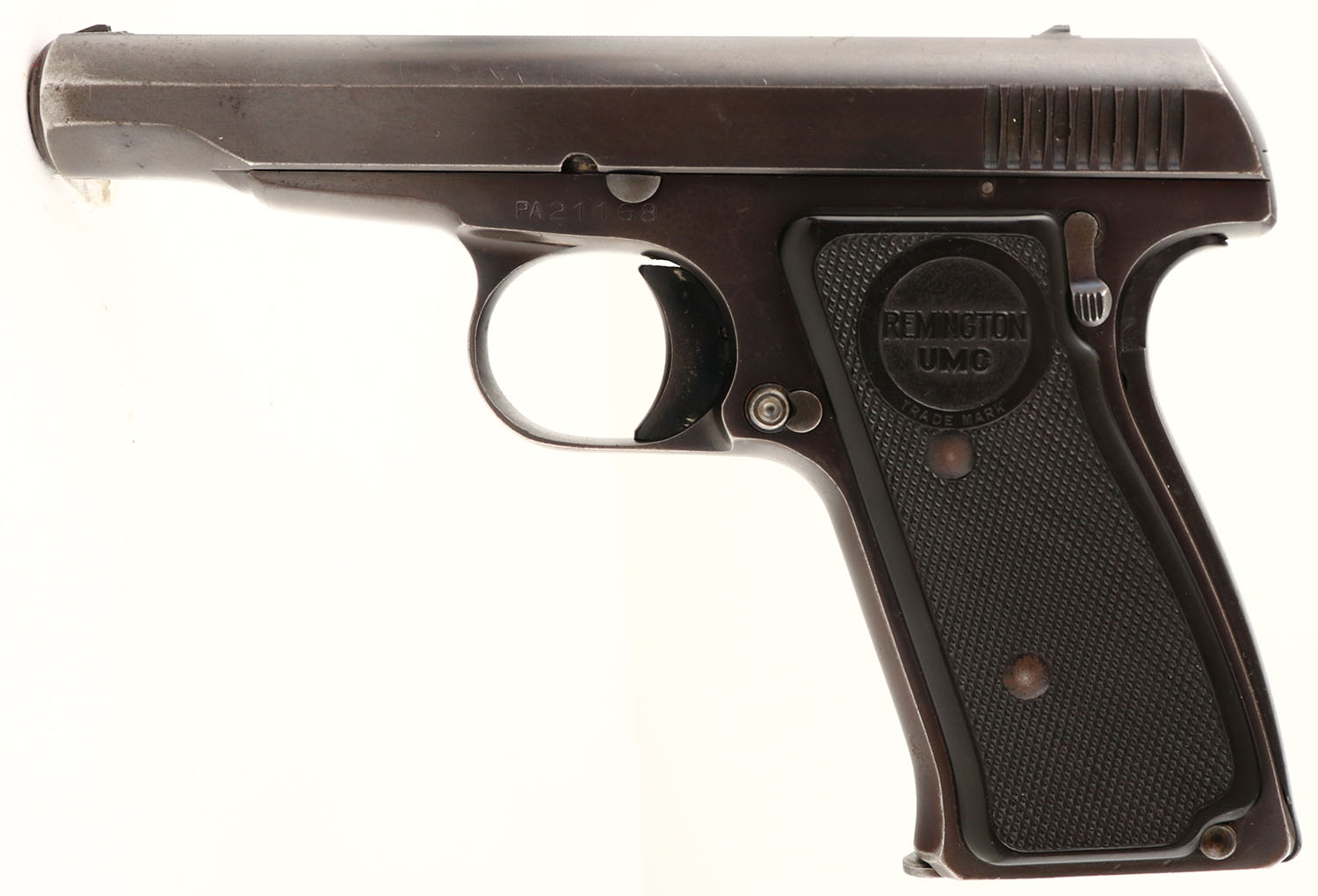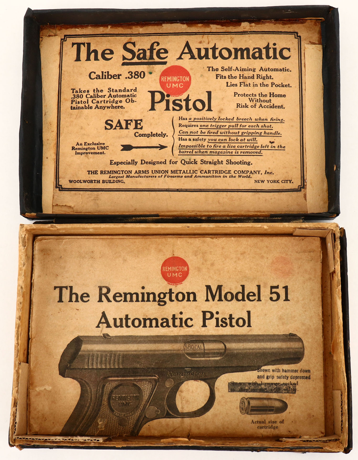 BOXED, Remington, Model 51, CAL: 380, MFG: 1918-26, SN: PA21168, Semi-Auto Pistol, 3 3/8'' barrel. The REM-UMC marked, checkered hard rubber grips are very good, with handling marks. The metal blue finish rates 80%, beginning to tone to brown patina, more so around the carry points, with light surface scrapes & small areas worn to metal gray. Bore is very good, with visible wear & defined rifling. Factory sights. Dual safety mechanisms. Comes in a correct period Remington box, with original paperwork. Box has been repaired on all corners, most seams glued or braced & the top has been recovered. FFL or C&R Req. - Value: 500 to 1000