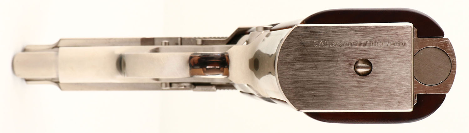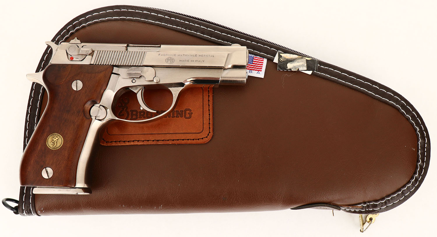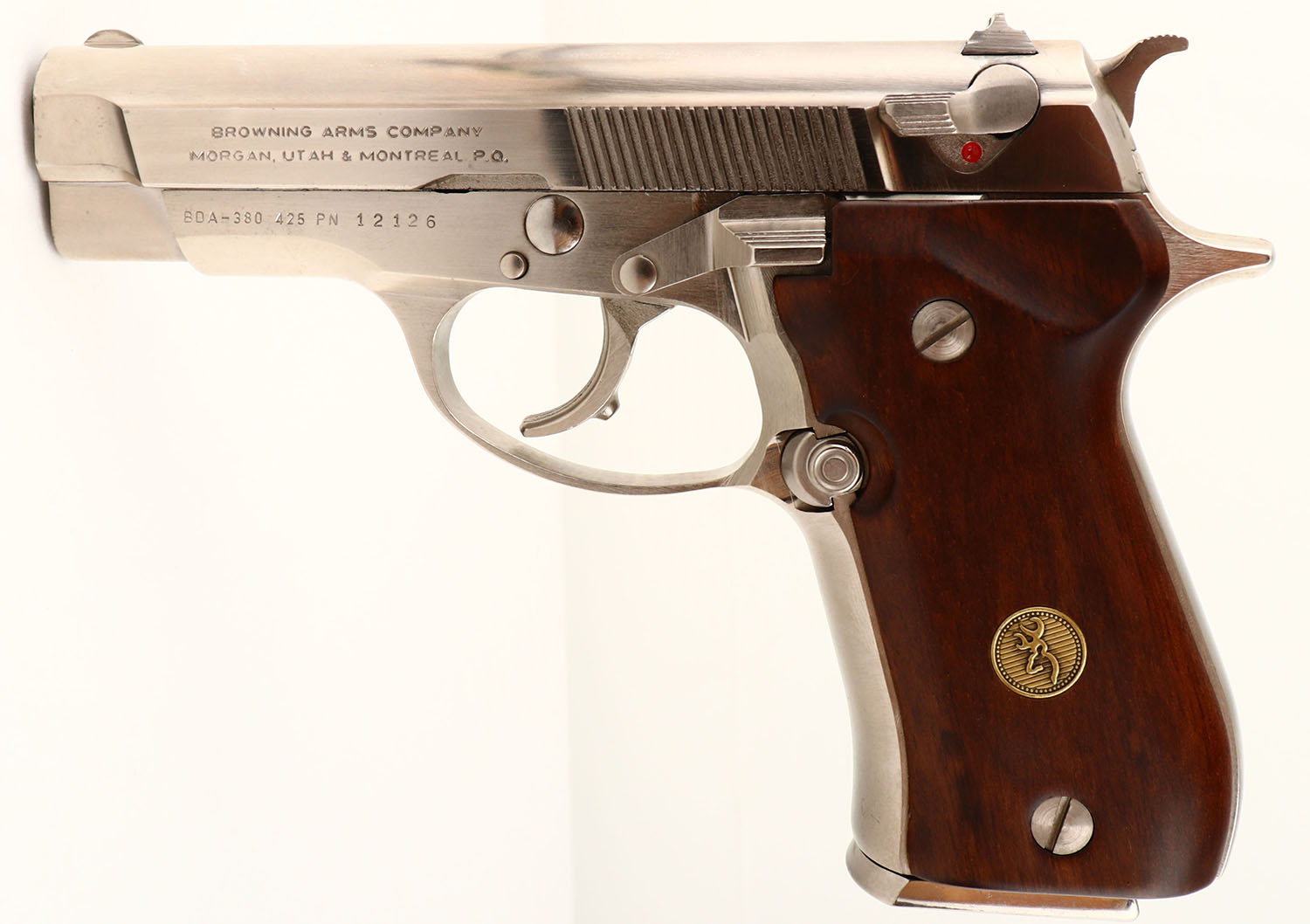 Browning, Model ''BDA-380'', CAL: 380, MFG: 1977-97, SN: 425PN12126, Semi Auto Pistol, 3 3/4'' barrel. The Browning logo grips are excellent, near mint. The high polish stainless steel finish is excellent, displaying thin brush lines, consistent with this type of finish. Bore is mint. The slide holds a standard square notch fixed rear sight & small half moon front sight. Comes in a Browning soft zipper case. A near mint BDA-380. FFL Req. - Value: 600 to 1000