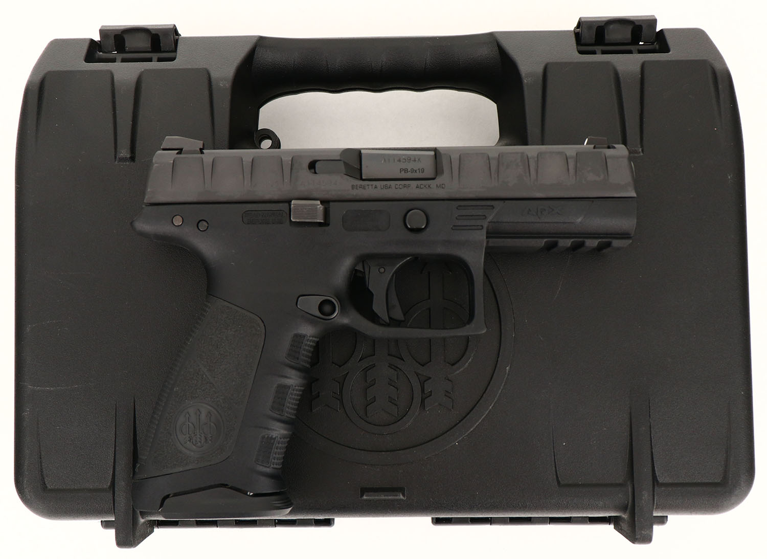 Beretta, Model APX, CAL: 9mm, MFG: Modern, SN: A114594X, Semi Auto Pistol, 4 1/8'' barrel. The Beretta marked Techno polymer frame is excellent. The matte black finish on the slide is excellent, rating 99%. Bore is near mint. Factory sights. Comes in the original hard case, with the owners manual, cleaning brush, lock, extra mag, extra grips & speed loader. FFL Req. - Value: 400 to 600