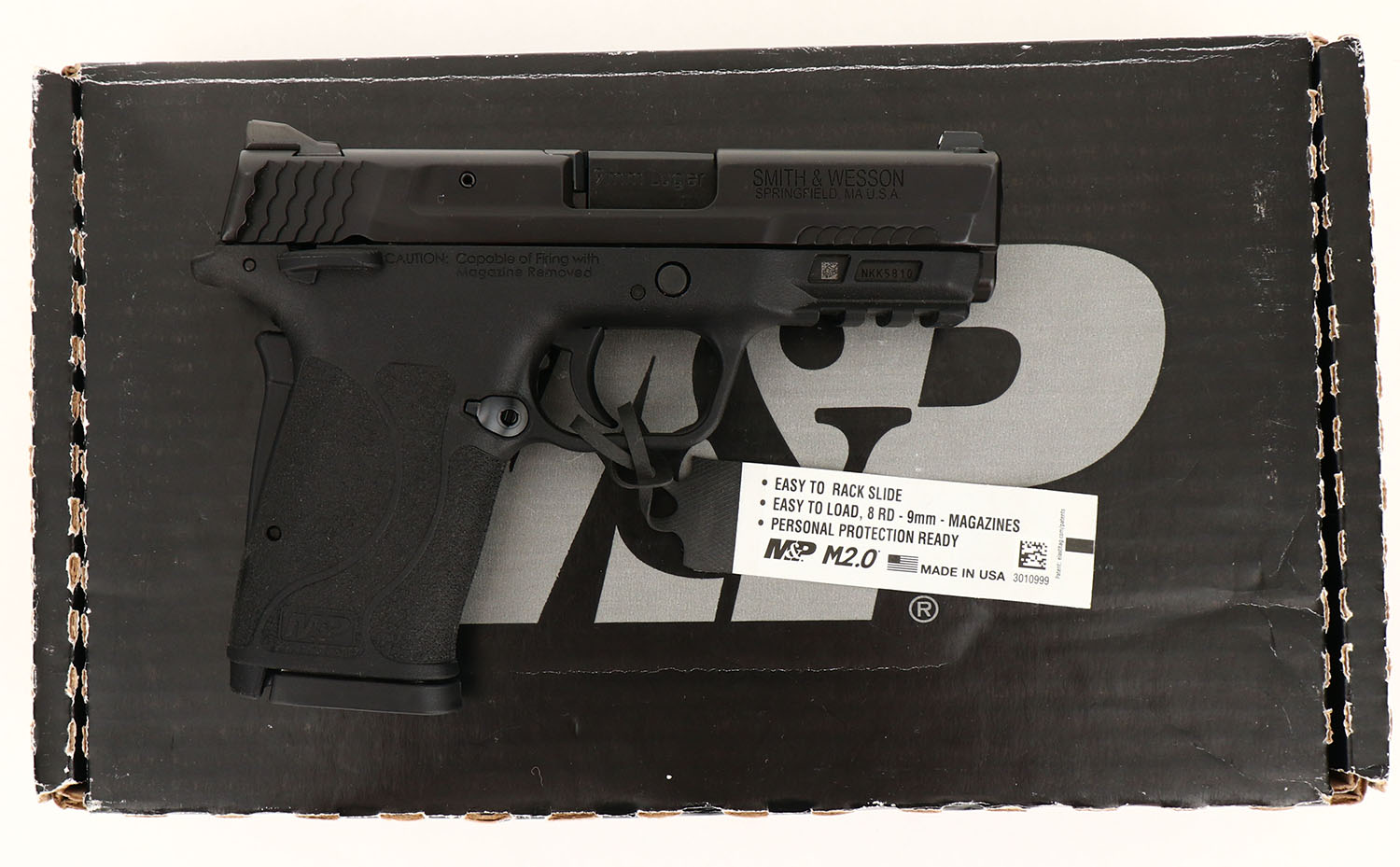BOXED, Smith & Wesson, Model M&P 9 Shield EZ M2.0, CAL: 9mm, MFG: Modern, SN: NKK5810, Semi Auto Pistol, 3 1/2'' barrel. The S&W marked textured polymer frame is excellent, with minor handling marks. The Armornite finish on the slide is excellent, with very minor surface scrapes. Bore is excellent, near mint. Bright white dot front & 2 dot rear sight. NIB. New old stock. Comes in original box, with owners manual, paper articles, lock & tool. This pistol has a very thin design & is lightweight, making it comfortable to carry all day & a perfect conceal carry pistol. FFL Req. - Value: 350 to 700