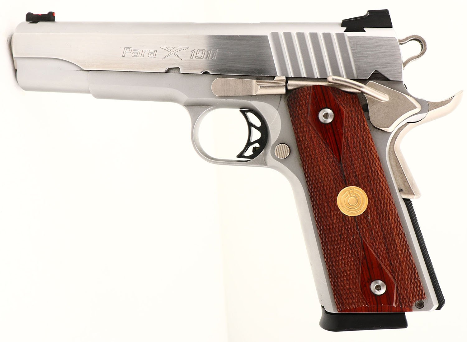 CASED, Para, 1911 ''Gun Rights'' Edition, CAL: 45, MFG: Modern, SN: P188912, Semi Auto Pistol, 5'' barrel. The Para logo medallion & checkered wood grips are excellent. The backstrap is checkered. The satin silver finish on the frame is excellent, with a minor drag line from the safety. The polished stainless steel slide is excellent, with minor handling marks. Bore is excellent, near mint. The slide holds a dual white dot rear sight & red fiber optic front sight. Comes in the factory hard case, with owners manual, extra mag, lock & tool. NOS. FFL Req. - Value: 500 to 1000