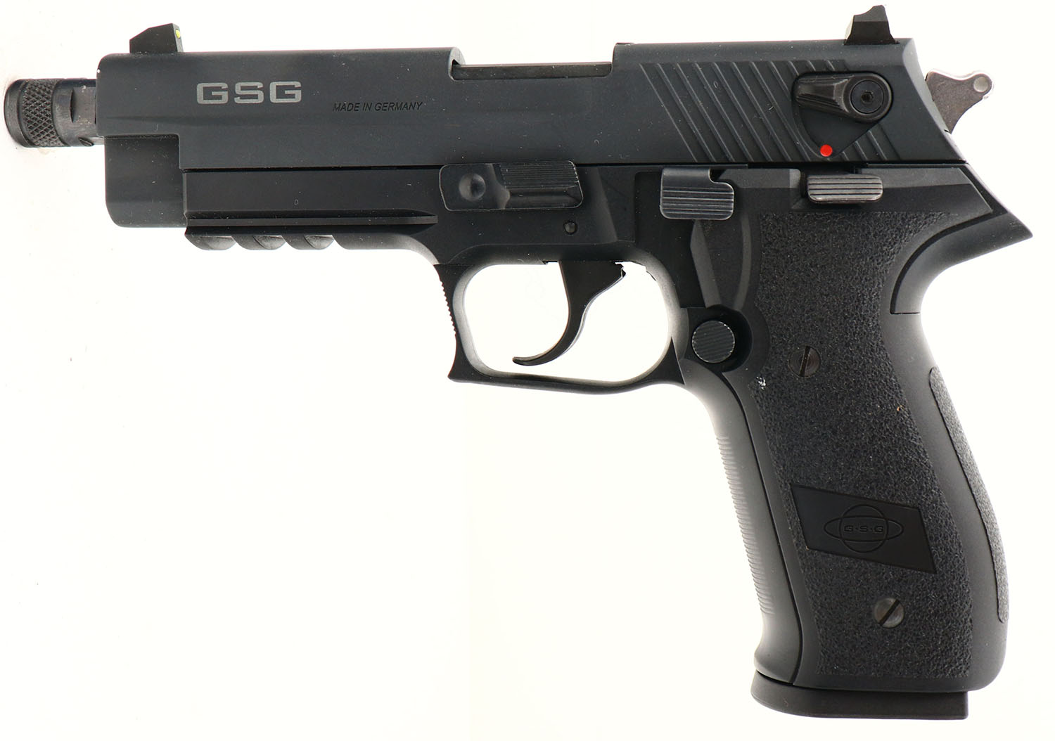 GSG, Firefly, CAL: 22LR, MFG: Modern, SN: F425918, Semi Auto Pistol, 4 3/4'' barrel. The textured black polymer grip frame is excellent. The matte black finish on the zinc alloy slide is excellent, rating 99%+. Bore is excellent & bright. The slide holds an adjustable dual yellow dot rear sight & single yellow dot front sight. Ambidextrous thumb safety. Threaded barrel for possible silencer attachment. A seemingly new semi auto .22 pistol. FFL Req. - Value: 150 to 300