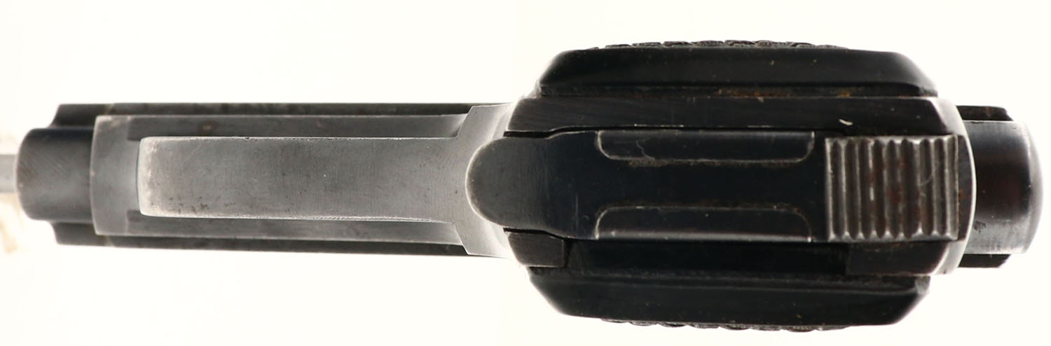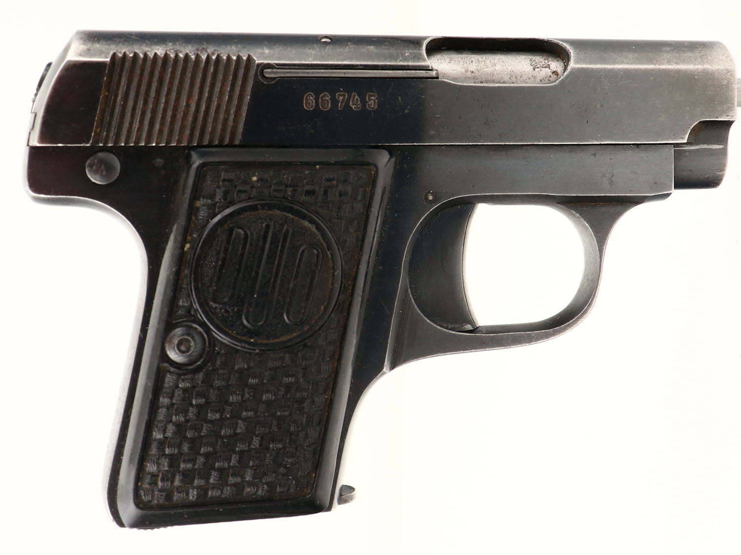 F. Desek, CZ Duo Pistol, 6.35 (.25) Cal., MFG. 1943, SN: 66745, 2'' Barrel, Hammerless single action semi-auto pistol, with detachable magazine. Designed by F. Dusek, but based off of John M. Browning's 1905 pocket pistol. Made in the CZ factory under German management in the WWII era. The original basket woven patterned black plastic grip panels are embossed with ''DUO'' & show almost no wear. The original metal blue finish rates approximately 85%+, with loss due to light scratches & wear at the edges. Grooved sight line. Magazine release at bottom of grips. Left side of slide stamped ''AUTOMAT. PISTOLE ''DUO'' CAL.6.35 / F. DUSEK, OPPTSCHNO''. Slide also stamped with the Prague proof house firing proof & is dated 43. The proof mark is also on the barrel at the ejection port. Comes with one magazine. Bore is excellent. A high quality European pocket pistol. FFL or C&R Req. - Value: 300 to 600