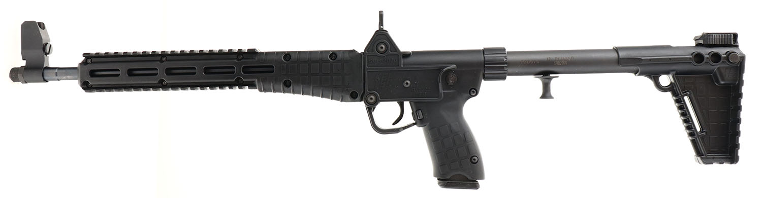 BOXED, Kel-Tec, Model ''Sub 2000'', CAL: 9mm, MFG: Modern, SN: FGD676, Semi Auto Rifle, 16 1/4'' barrel. The folding plastic stock, with textured grip & forend are excellent. The matte black finish rates 99% overall. Bore is excellent. The receiver holds a small peep sight & the barrel holds an elevated front sight. The forend has full picatinny rails for accessories & optics. NIB. New old stock. Comes in original box, with owners manual & mag. A great gun for backpacking. The SUB-2000 design is a rather unusual folding design that breaks down for storage into half its total extended length & does not fire when folded. FFL Req. - Value: 400 to 800
