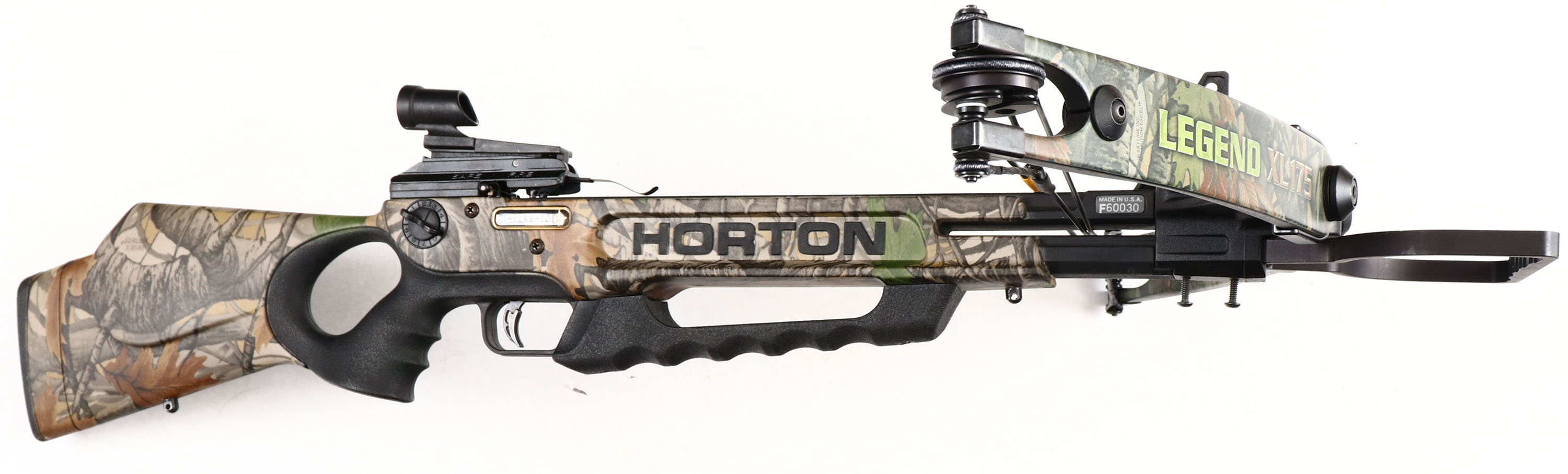 Horton, Model: Legend XL175, Cross Bow, Synthetic camo stock, side post front sight, Elevation adjustable aperture rear sight. Grade: Excellent + - Value: 50 to 300