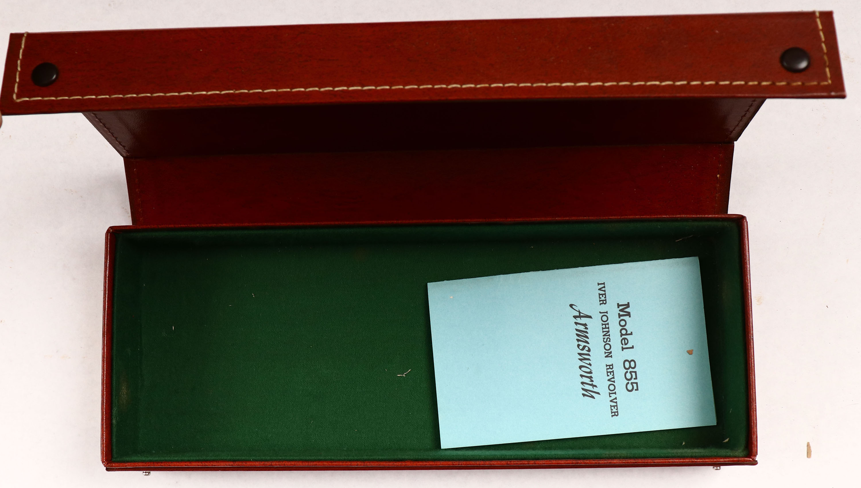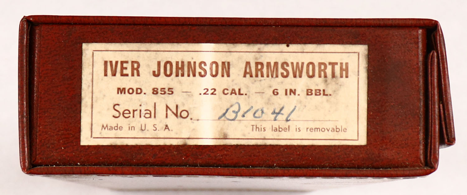BOX ONLY for Iver Johnson Armsworth Model 855 Armsworth Revolver Original factory N.O.S. revolver snap close box, came from the remaining inventory when factory closed. Has label for Model 855 Armsworth .22 Cal. 6'' BBL,& comes with the original blue brochure for this model. Condition is excellent. - Value: 10 to 100