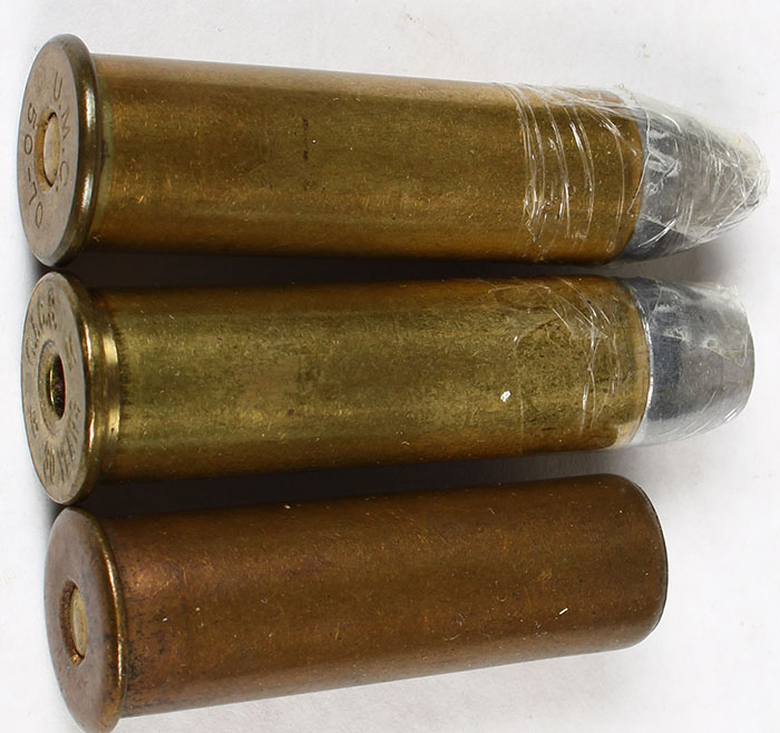 Lot of 3 H/S= ''C.I.C.S. GM 30 years'' 50-70 souvenir show cart. blind pocket blunt LD. H/S= ''U.M.C. 50-70'', oval BR. PRL. Conical LD. N/H, 50-70 blank, oval BR. PRL. Tan wad. Grade: Excellent - Value: 20 to 40