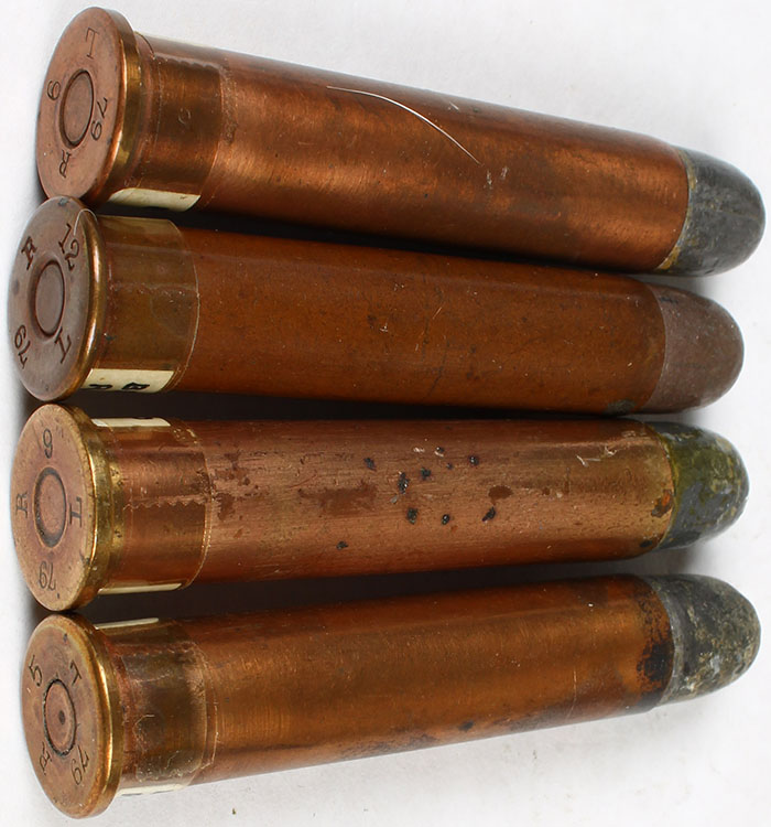 Lot of 4. 45-70 Military Contract by USC. Brass Case w/ thin rim. (3) HS=''R L 79'' with months ''6, 9, 12'', 405 gr. RN Lead. (1) HS=''R L 5 79'', 500 gr RN Lead (snapped primer). Condition Very Good - Value: 20 to 50