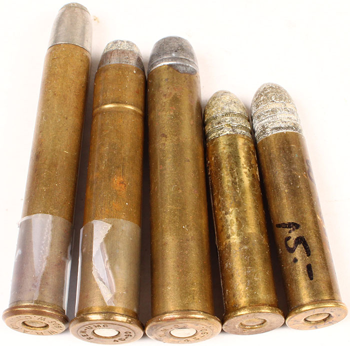 Lot of 5. All brass cases. (2) 44 Long Wesson NHS, RN 3 groove lead. (1) 405 Winchester HS=''W.R.A.CO. .405 W.C.F.'', CN SP. (1) 45-90 WCF HS=''U.M.C. 45-90'', Blunt RN Lead. (1) 45-90 WCF HS=''REM-UMC 45-90'', CN FN SP Cannelure 1/4 down from casemouth. Condition Very Good - Value: 20 to 40