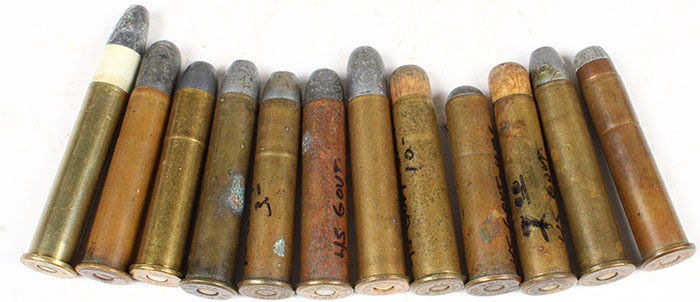 Lot of 12. 45-70 Govt. (8) Commercial rounds by Winchester, Western, Remington & United States Cartridge Co. Various bullet loadings including 2 half jacketed SP. SEE PHOTO. (2) Shot Loads by UMC, HS=''U.M.C. 45 GOVT.'', Plain wood sabot. (1) Multiball by UMC HS=''''U.M.C. 45 GOVT.'', round lead ball case cannelure 1/3 of way down from case. (1) 45-70 military load HS=''F 10 87'', 500 gr. RN Lead bullet. Condition Very Good - Value: 20 to 60