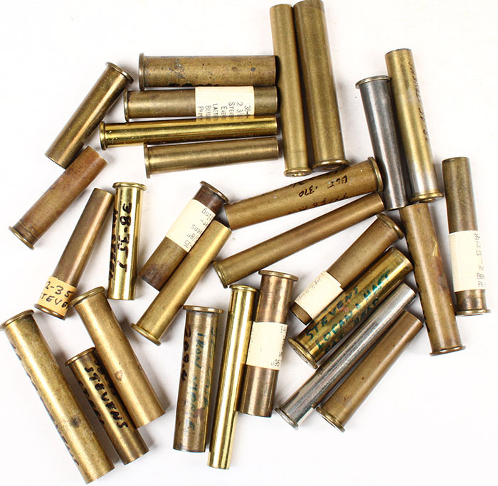 Lot of 28 very early stevens rifle case's, six diff calibers. None of these are loaded: (2.) 44-65, (5.) 44-50, (5.) 38-45, (5.) 38-35, (6.) 32-35, (5.) 28-30-120. Grade: Very Good - Value: 20 to 40