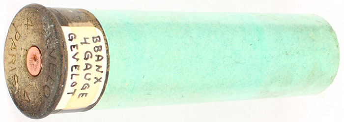 H/S: Gevelot Paris 4 ga, dented copper primer, not loaded, teal paper case. Grade: Excellent - Value: 10 to 80