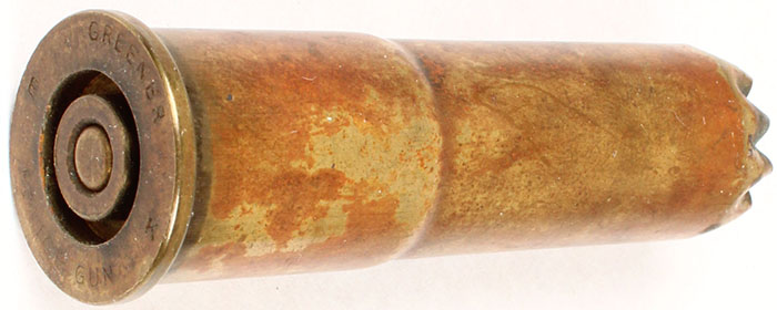 H/S: Greener E K Police Gun, 2 13/16'' OAL. TW: SG, loaded brass shotshell. Grade: Excellent - Value: 10 to 100