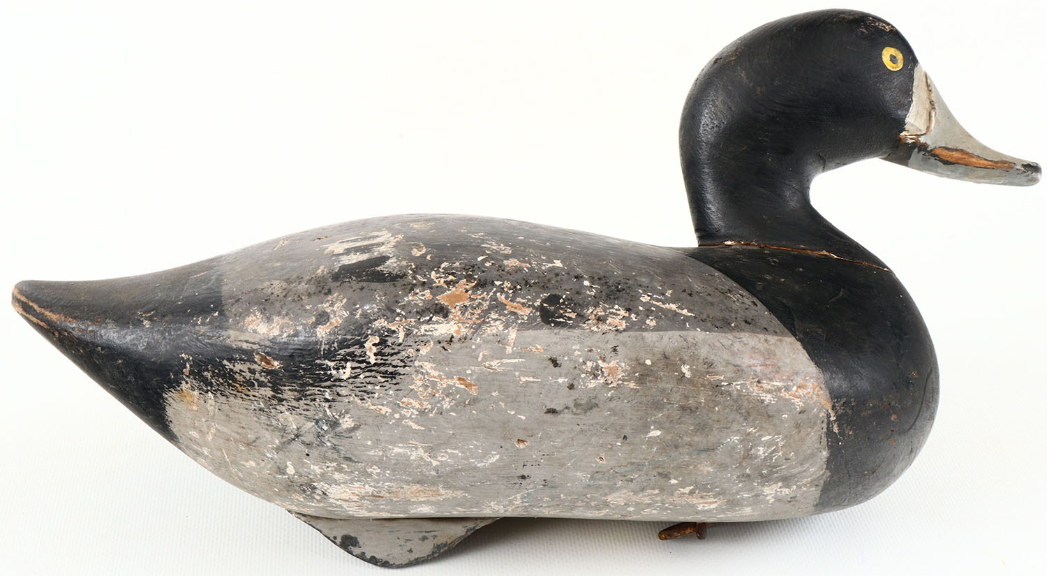 Bluebill Drake by R. Madison Mitchell, Havre De Grace, MD. Circa 1945, painted eyes, solid wood, original paint with typical wear, has hairline crack in neck, lead weight on bottom. Grade: Very Good ++ - Value: 200 to 350