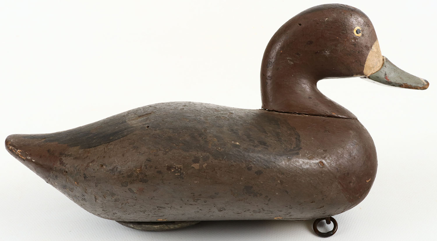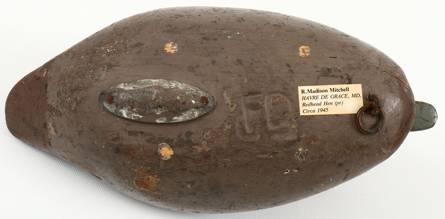 Bluebill Hen by R. Madison Mitchell, Havre De Grace, MD. Circa 1945, painted eyes, solid wood, original paint with light wear, lead weight on bottom. Grade: Excellent - Value: 200 to 350