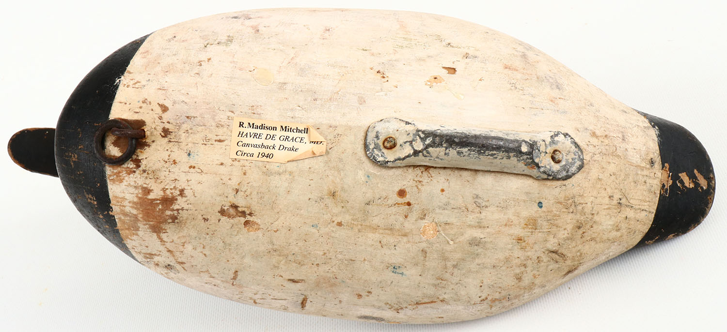Canvasback Drake by R. Madison Mitchell, Havre De Grace, MD. Circa 1940, tack eyes solid wood, original paint with typical wear, has hairline crack in neck, lead weight on bottom. Grade: Very Good ++ - Value: 150 to 300