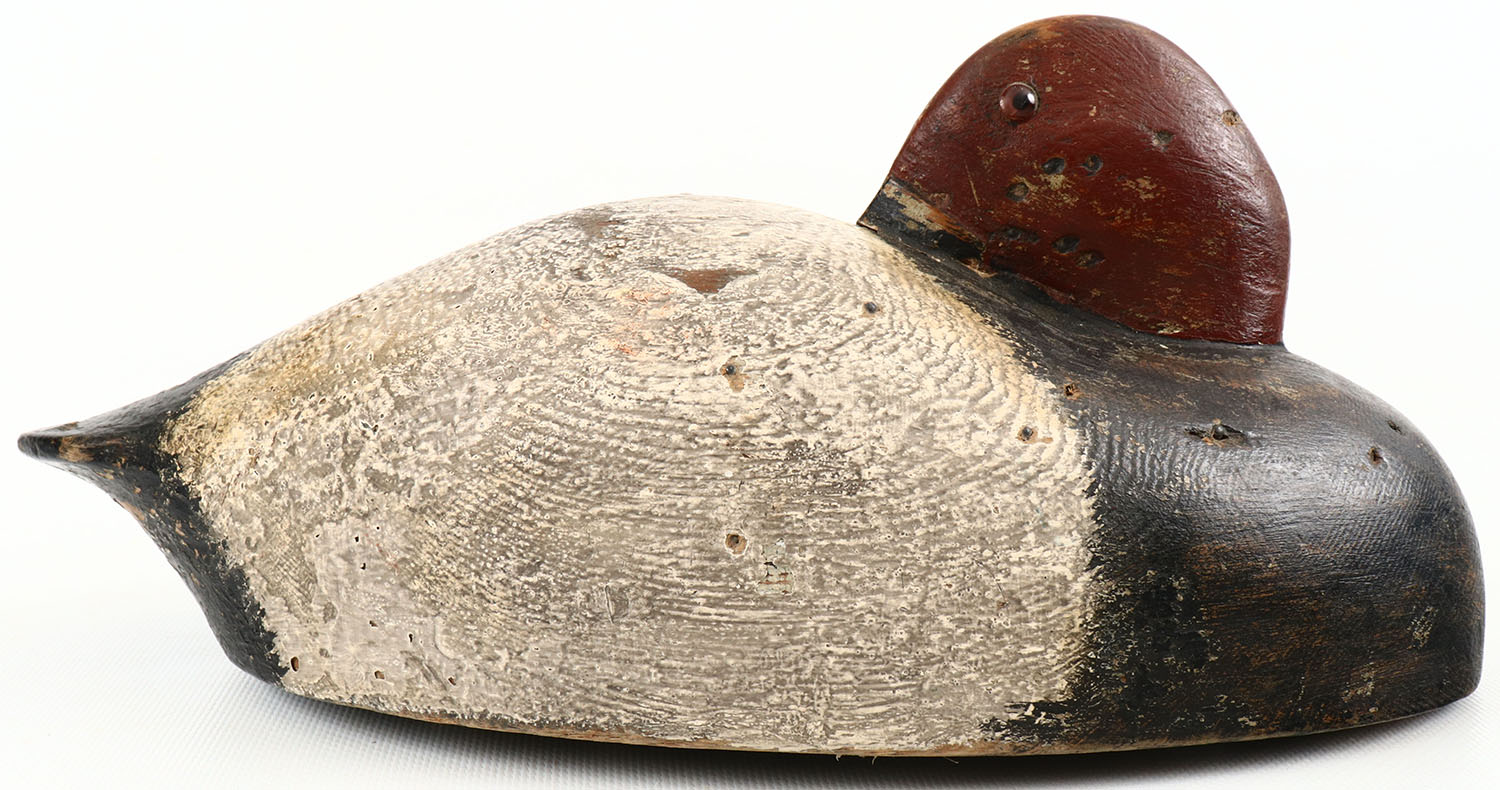 Very Rare Sleeping Canvasback Drake. Glass eyes, solid wood, original paint, some edge wear, Canadian Antique Working Decoy, This bird is thought to have been primarily used along the shores of the mighty Lake Ontario on the wild and wooly cold days of late November and December when the Canvasbacks migrated from the Arctic down through North America to their summer homes as far south as the Gulf of Mexico. This bird is credited to Ward Brothers of Wards Island off the shores of Lake Ontario near Toronto. Grade: Excellent - Value: 300 to 550