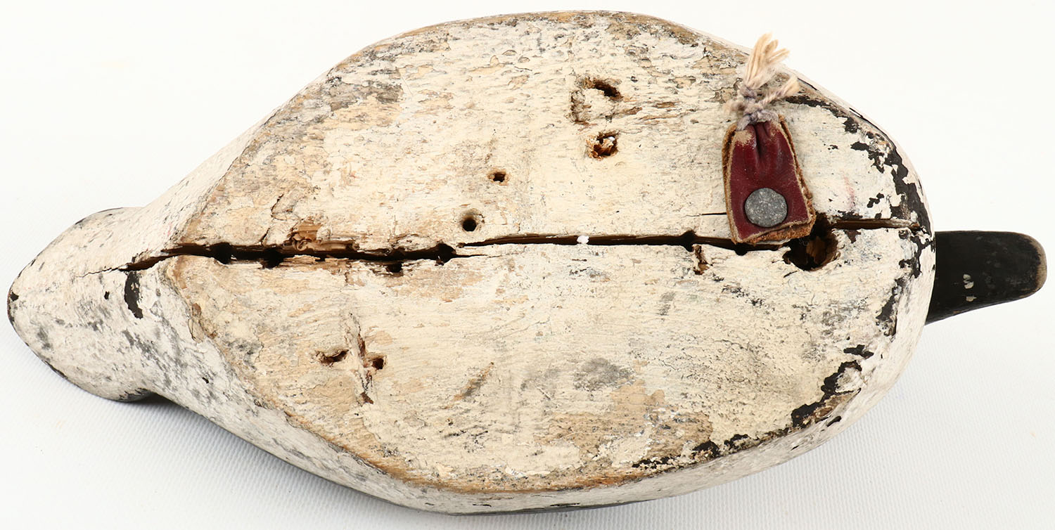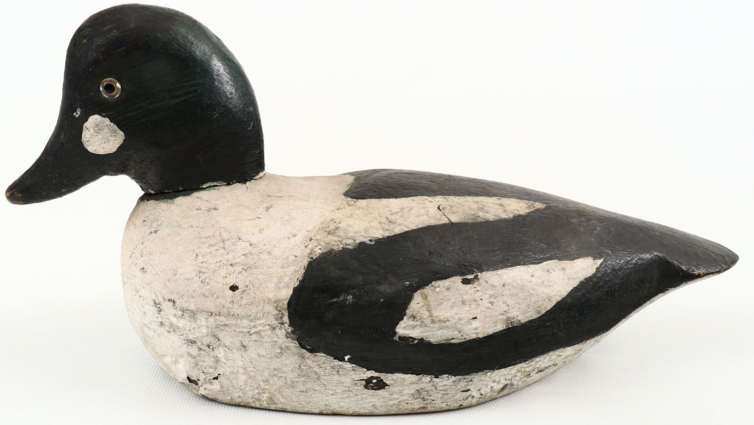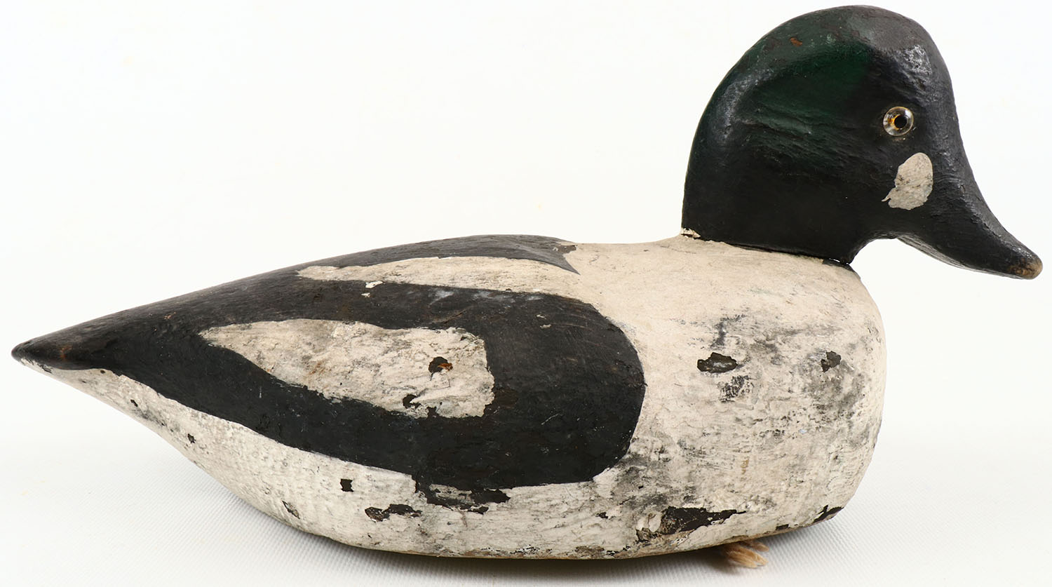Goldeneye Drake by unknown maker. Glass eyes, solid wood, original paint, has age crack down the middle on the bottom. Grade: Excellent - Value: 50 to 100