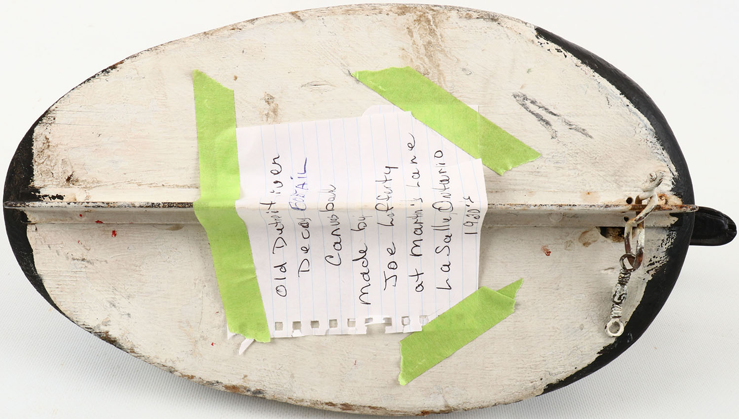 Canvasback Bobtail Drake by Joe Lafferty at Martin's Lane Lasalle, Ontario 1930's, glass eyes, solid wood, excellent original paint, structurally excellent, lead weight on bottom. Grade: Excellent + - Value: 40 to 150